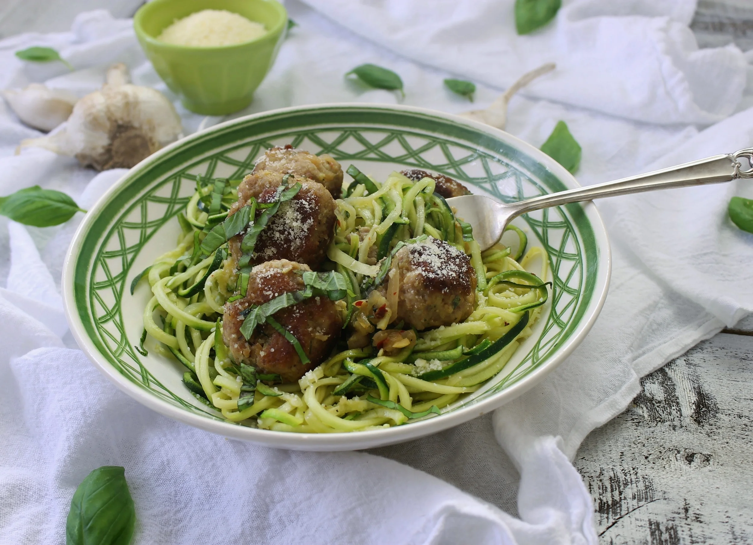The zoodles are coated in a white wine and garlic sauce and the meatballs are tender and full of flavor and just so happen to be one of my favorite comfort foods. Topped with fresh basil to bring it all home, this meal will make your belly very happy and you won't even miss the pasta.