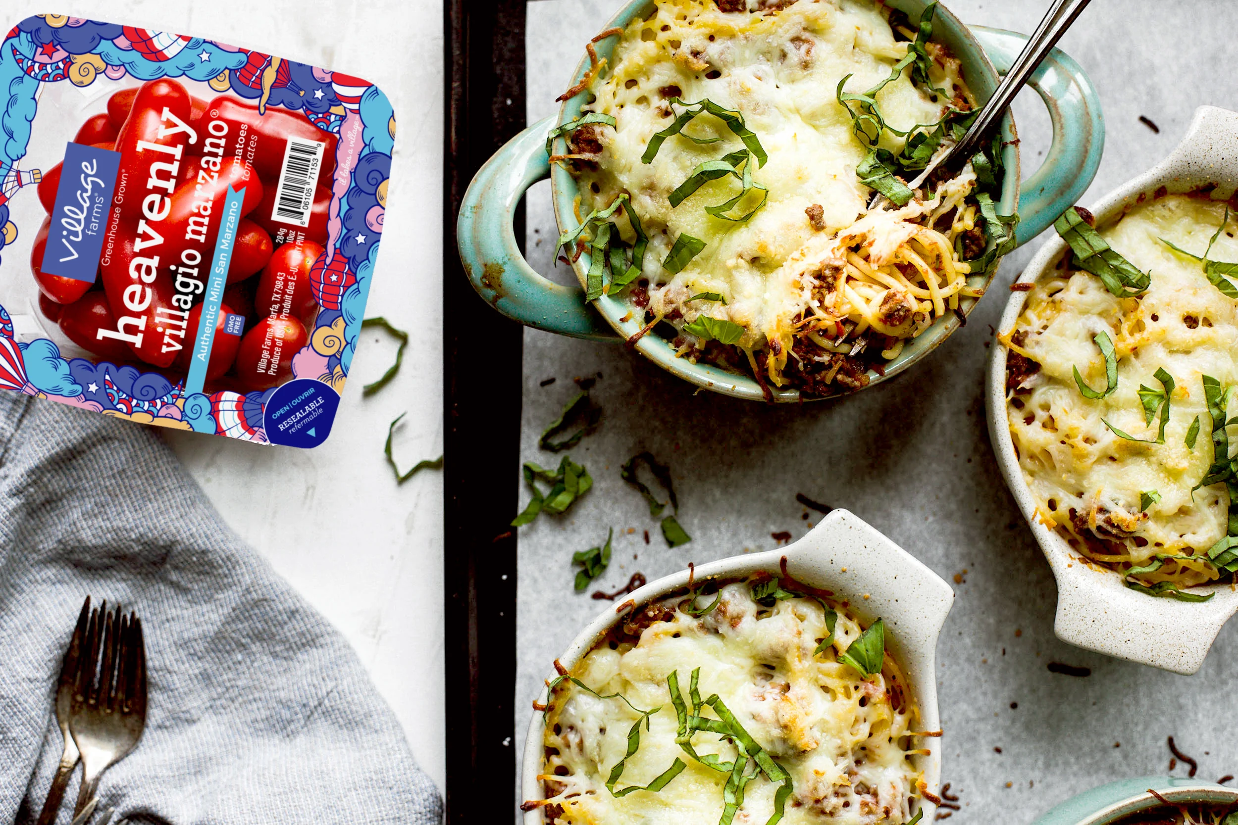 Have you heard the news? I’m launching a brand new virtual Supper Club where we can come together as women and share, cook, eat, and get to know one another all through the touch of a screen! With the launch of this supper club, I am hoping to bring back a sense of community among other women, share delicious recipes, find out more about YOU, and to bring a little fun back into cooking! I partnered with Village Farms to bring you two of my favorite easy recipes that are perfect for a gathering of friends and family, or in this case they are perfect for any supper club! My Green Monster English Muffin Pesto Pizzas with roasted tomatoes and my Individual Baked Spaghettis are super simple to make and they are guaranteed to delight kids and adults a like!