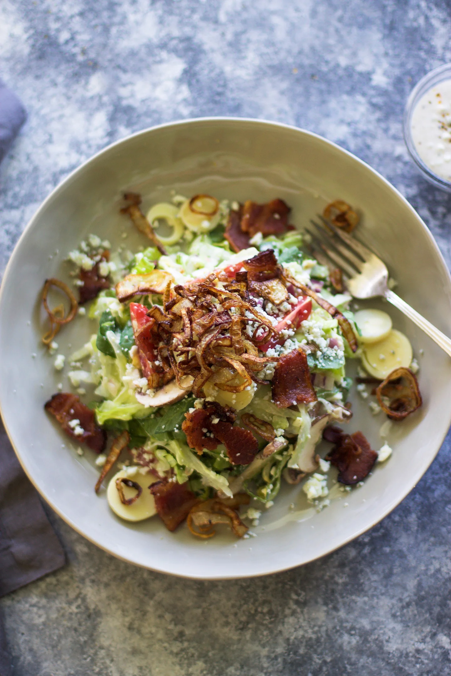 Happy Monday! How was your weekend? I hope it was as good as mine! Parks and I flew back from Georgia on Saturday and spent the rest of the weekend hanging out with daddy. We played in the sprinkler, Canean cooked dinner for me (grilled BBQ crabs and oysters Rockefeller...whhhatttt!) He definitely spoiled me this weekend and I took full advantage! Today I'll be back in the kitchen and catching up on a week from being out of town. Anytime I have busy weeks like this I am always looking for easy meals that taste amazing. My ultimate steakhouse-style salad is one of those wow salads that you totally could have as a meal alone or you can serve alongside a juicy steak! Your choice!