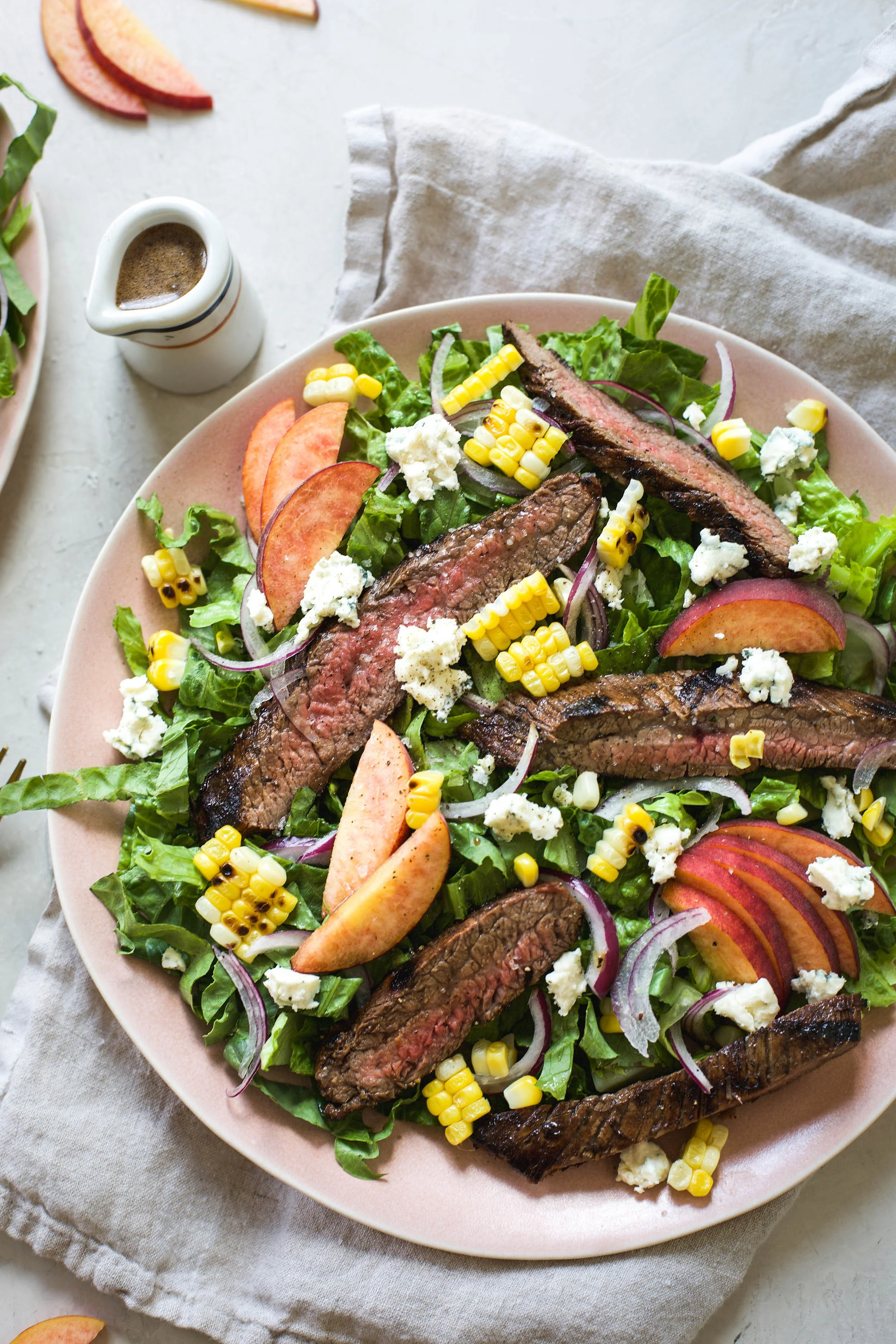 Flank steak is one of my favorite proteins to add to a salad and grilling it is my favorite method of preparation. I marinate flank steak with some balsamic vinegar and then grill it and add it with some of my favorite summer produce like peaches and corn and the combination is pretty epic! I would go as far as to say that this is hands down my new favorite summer salad. This salad is simple to make, healthy, and so delicious too. I can’t wait for you to try this grilled flank steak and peach salad with a balsamic dijon vinaigrette, it’s going to quickly become a new favorite around your house.