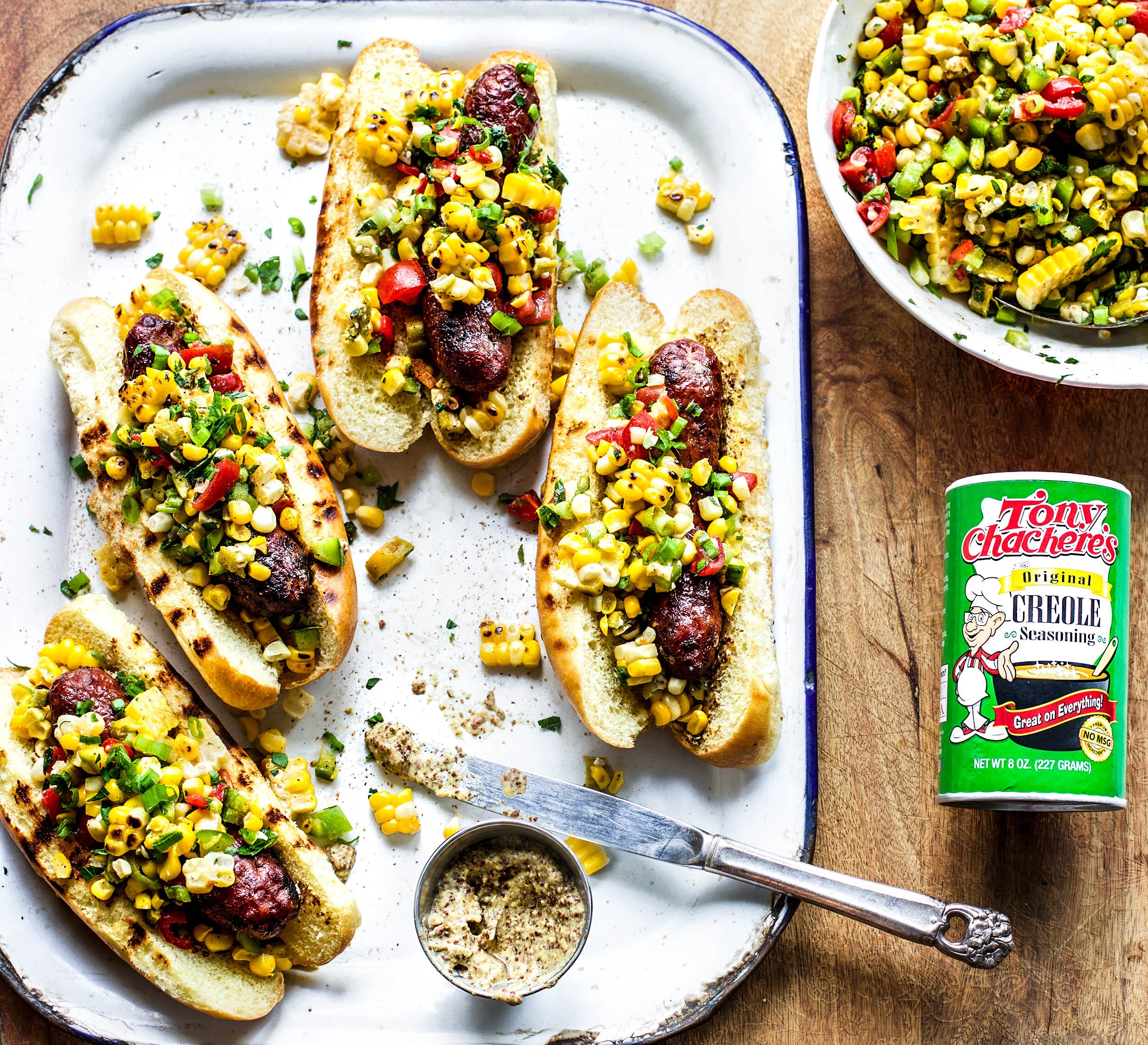 Summertime means lots of grilling is happening at my house for a couple of reasons. Number one, grilling means not having to turn on the oven or the stove on when its scorching outside, and number two, grilling makes clean up a breeze when you don’t have dishes to wash after the meal is done. Need I say more? I partnered with Tony Chachere’s to bring you a super simple, but out of this world tasty recipe that you are going to want to make all season long. Grilled sausages get sandwiched between a perfectly grilled bun and topped with a Cajun corn salsa to create the ultimate summer grilled sausage dog. I can guarantee that this recipe for grilled sausage dogs with Cajun corn salsa is going to make you do a happy dance with every single bite.