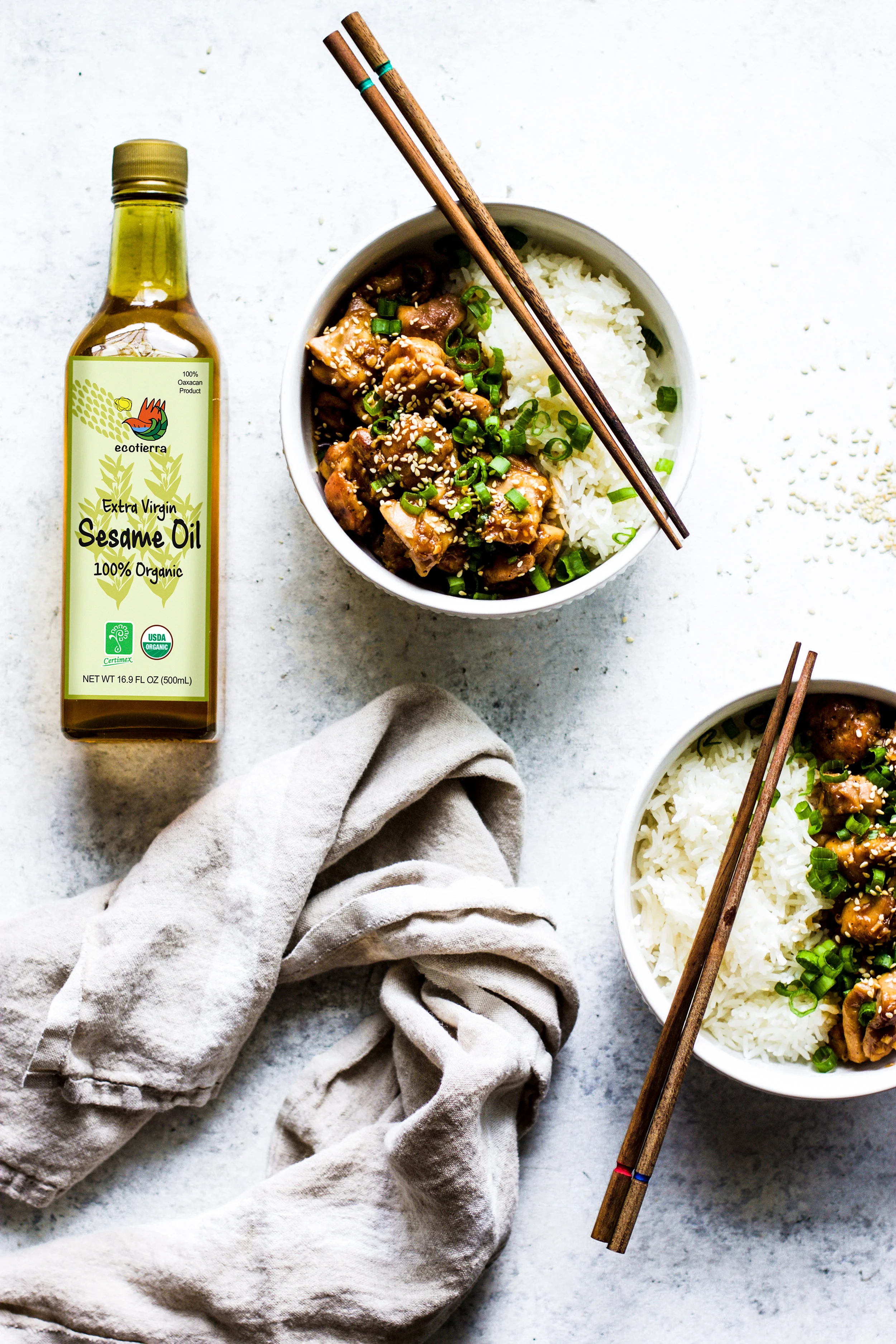 I have a few go-to cooking oils that I like to have on hand at all times. One of those oils happens to be sesame oil because I love the flavor that it can give food and because of the health benefits too! Even more than that, I love to find oils that are sourced responsibly and if they have a story behind the brand, even better. I recently discovered PURA Collective and their Ecotierra Organic Extra Virgin Sesame Oil and Organic Toasted Sesame Oils and fell in love with the flavor, quality, and the mission behind this company. After getting to know more about PURA Collective and tasting these oils, I developed this spicy garlic sesame chicken using their Ecotierra Extra Virgin Sesame oil that is the perfect weeknight meal for the whole family!