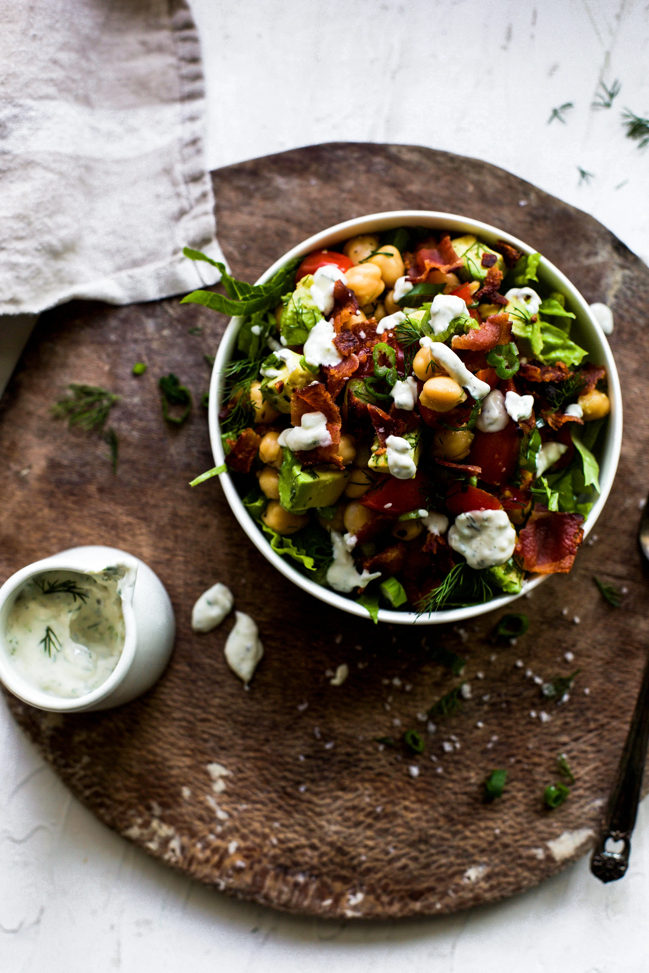 With Spring on the brain, I am suddenly in the mood for all sorts of salads and color on my plate! It has been unusually cold here this week in Texas, but that does not change the fact that I have been day dreaming about sunny Spring days that are in the very near future! While wintery meals tend to be more laborious, I love how with the switch of seasons, meals become more simple and effortless. Simple salads are one of my favorite things to make at this time of year when the days gets longer and the weather gets nicer! Even better, are salads that can be prepped in advanced and eaten throughout the week for easy lunches or dinners! My Chickpea BLT Salad with Cilantro Dill Dressing is a salad that is packing serious flavor and will quickly become one of your new favorites!