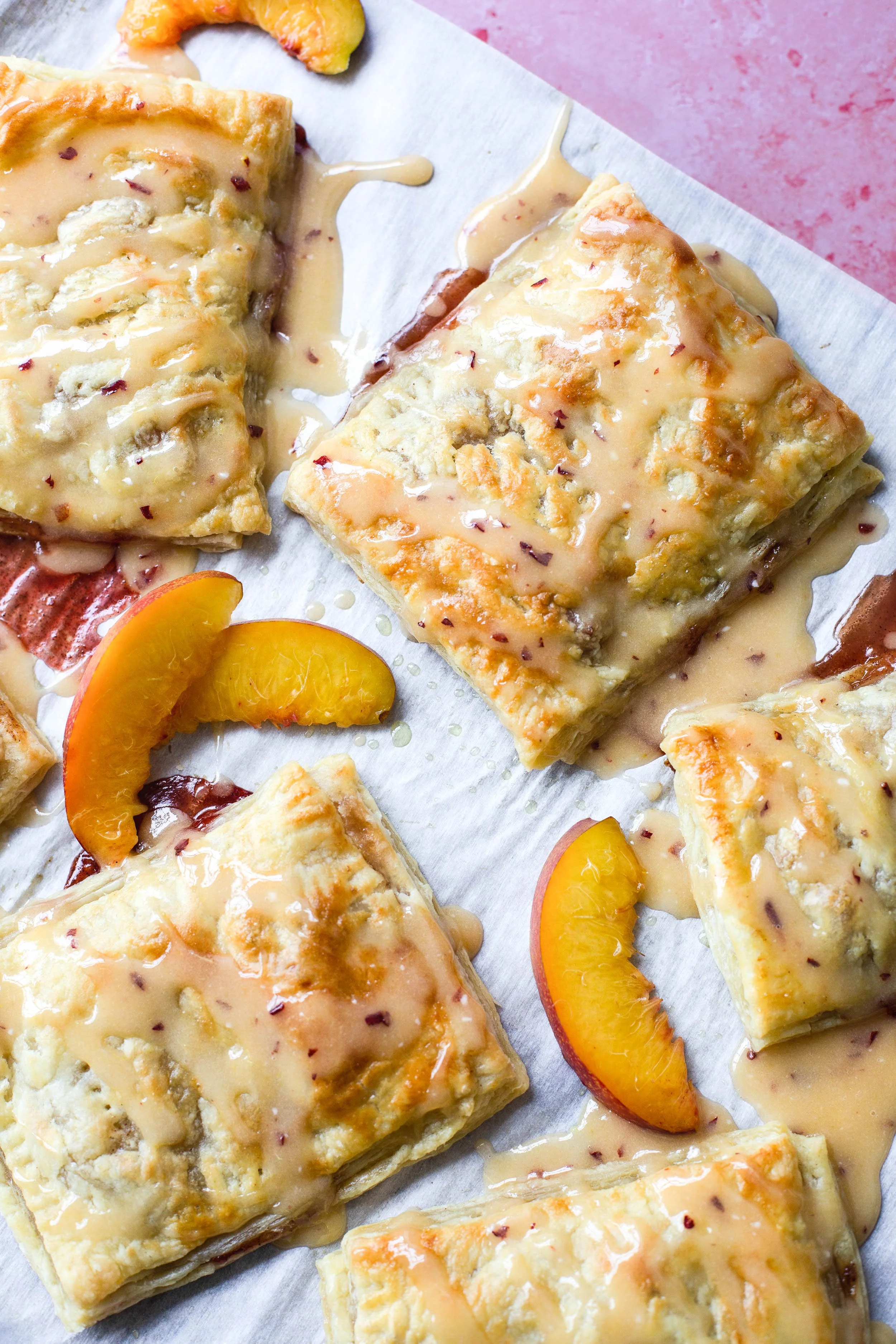 If pop tarts and toaster strudels had a baby, these cinnamon peach strudels would be it, and man are they delicious! I had some overly ripe peaches and nectarines that my family had decided would rot in the fridge because they were too soft and I decided to rescue them by making these tasty peach strudels! They are easy and so perfect for summer whether you eat them plain or warm with a scoop of vanilla ice cream. Do yourself a favor and make these delicious cinnamon peach strudels with a vanilla peach glaze the next time you grab some peaches.