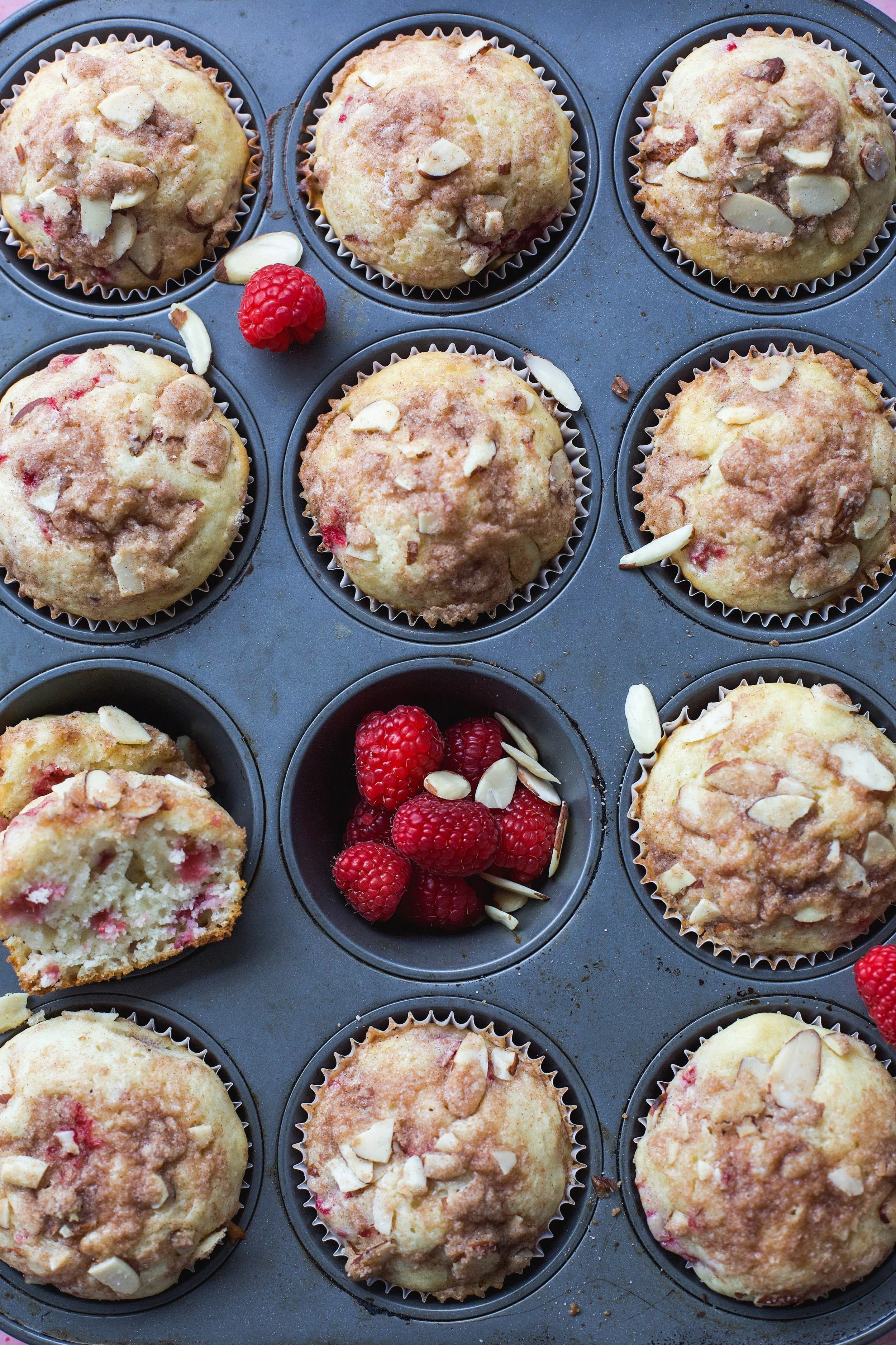 Up your breakfast game with these delicious raspberry muffins. Muffins are one of those go-to make ahead breakfast or snack items that I love to make because they store so well and the whole family loves them. I love using all types of berries in muffins, but I am all about raspberries and their slight tartness that they give the muffins. That tartness and the subtle hint of almond extract and a crumbly topping makes these muffins as good as your favorite local bakery muffins. This recipe for raspberry almond streusel muffins is one that you are going to want to make on repeat.