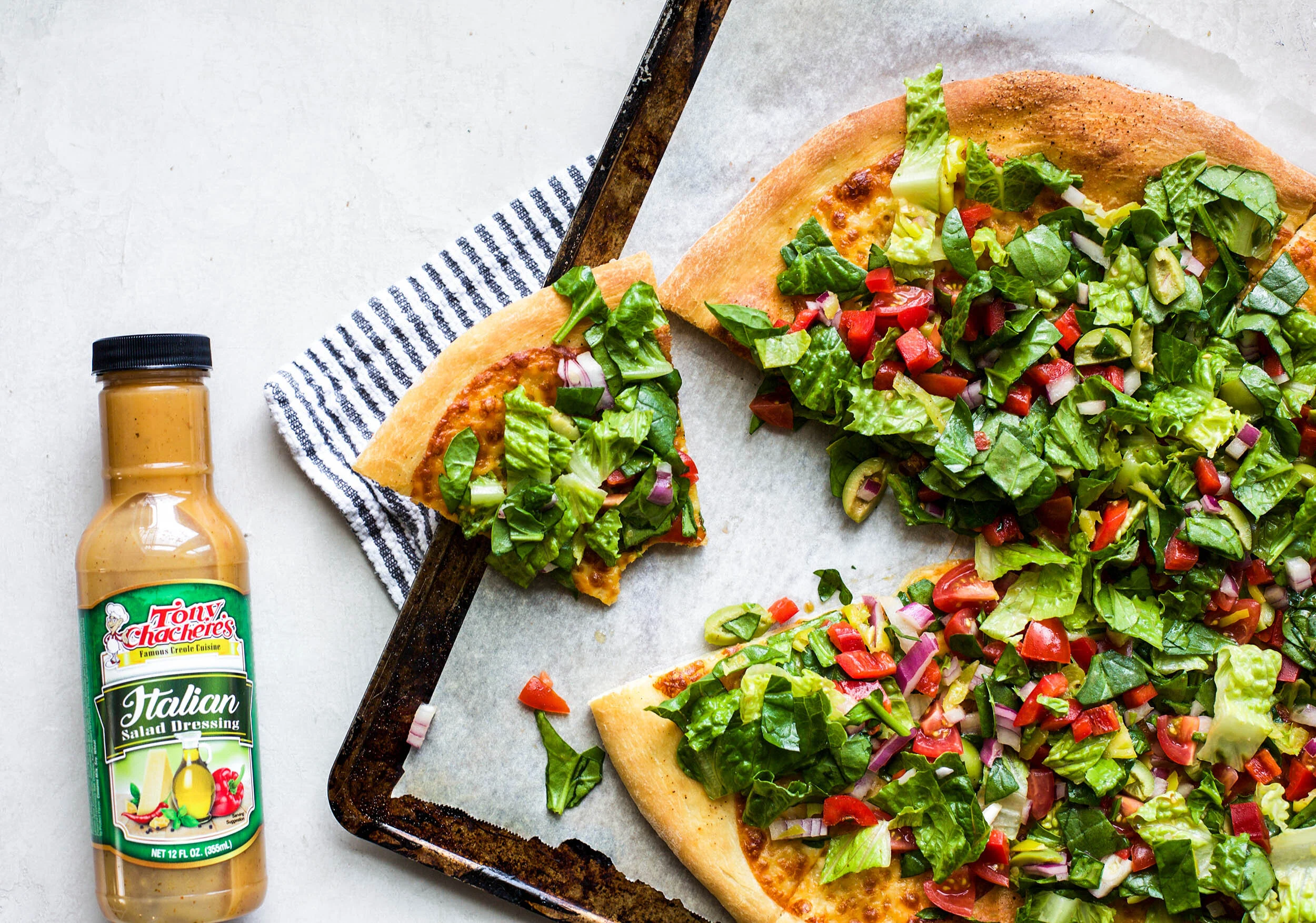 Pizza is one of those meals that I know my family will be on board with any night of the week. I started making my own pizzas years ago once I realized how easy and how delicious it could be. With the availability of store bought pizza dough in regular grocery stores nowadays, making homemade pizza has never been easier. I partnered with Tony Chachere’s to bring you a chopped salad pizza using their new line of salad dressings that combines pizza and salad together in perfect harmony. You may be thinking, salad on pizza? But trust me, it’s the best of both worlds and makes me feel a little better about serving up my weekly pizza to my family! Plus anytime I can get my toddler to eat more salad, is a meal that I will continue to make over and over. My chopped salad pizza is going to quickly become one of your family’s new favorite ways to eat pizza!