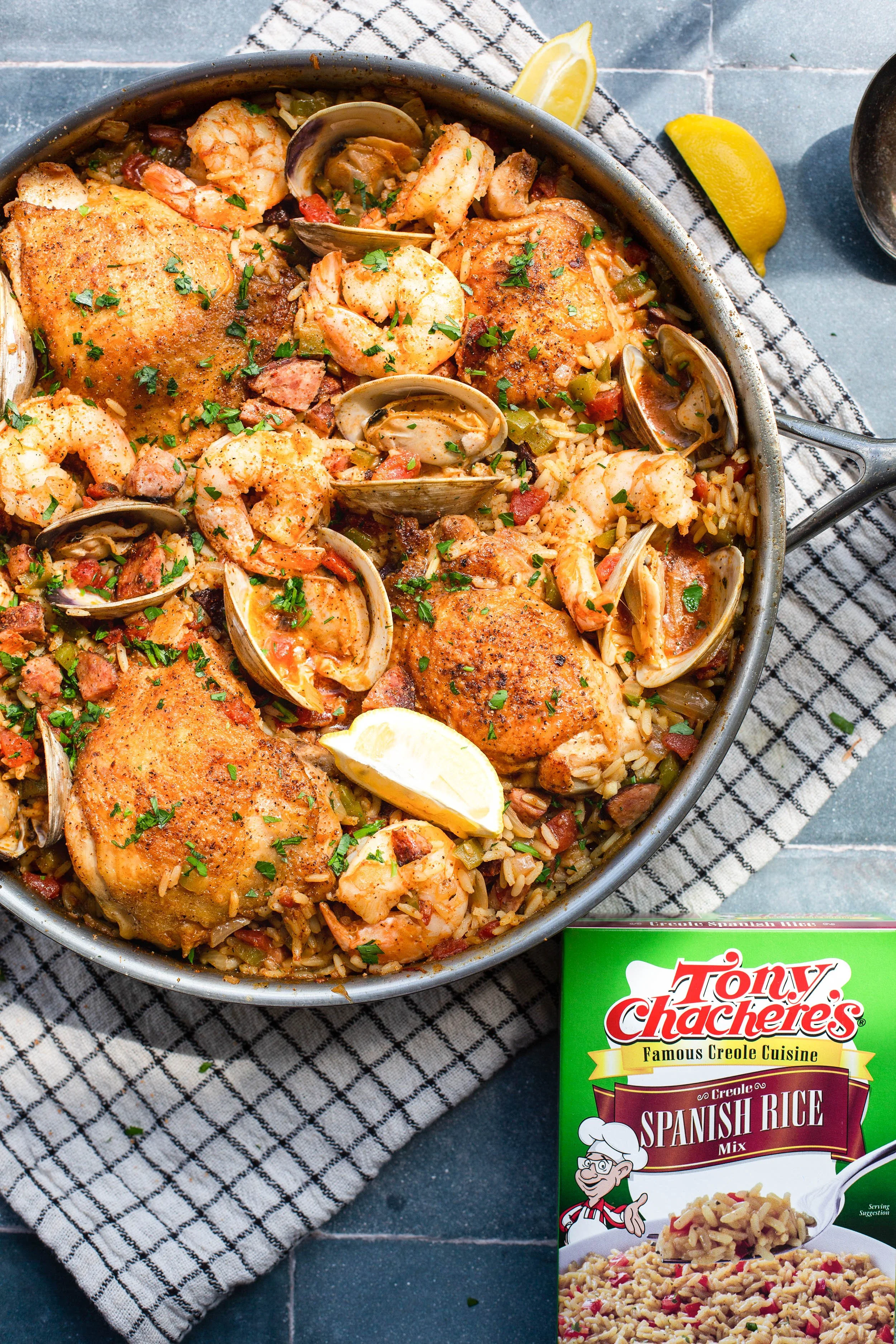 Paella is traditionally a Spanish rice dish that is made with meats and seafood all cooked up in the same skillet that is full of flavor. I created my own twist on the traditional version and created a Cajun version that has all of the same components that makes you fall in love with a Cajun flare that is so delicious. I partnered with my friends at Tony Chachere’s to create this delicious Cajun Paella that is made with andouille sausage, chicken thighs, seafood, and their Creole Spanish Rice Dinner Mix that makes this recipe extra easy to whip up! While this Cajun paella is easy enough for any night of the week, it is also perfect if you are entertaining for family or friends.
