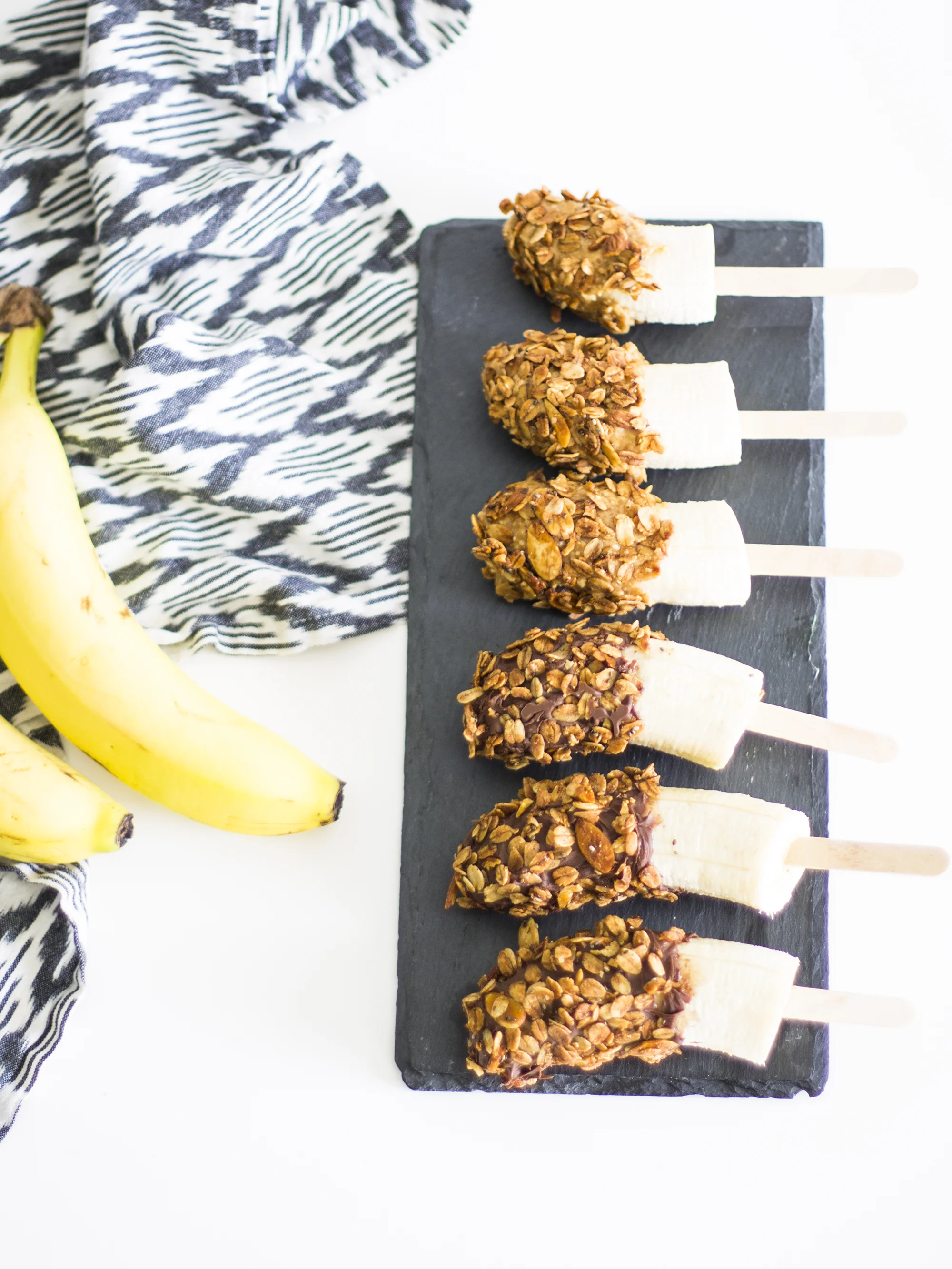 Lately if my fridge isn't stocked with go to healthy options, you can find me eating whatever is in reach and that is not a good situation! I don't have the patience to fix something, or to think about what I want, so prepping my food in advance has been key during this pregnancy! Honestly it's a great practice to get in the habit of even if you aren't pregnant, especially if you are trying to stick to a healthy eating plan! My recipe for granola banana pops are perfect to keep in your freezer for on the go breakfasts and afternoon pick me ups that you can feel good about eating!