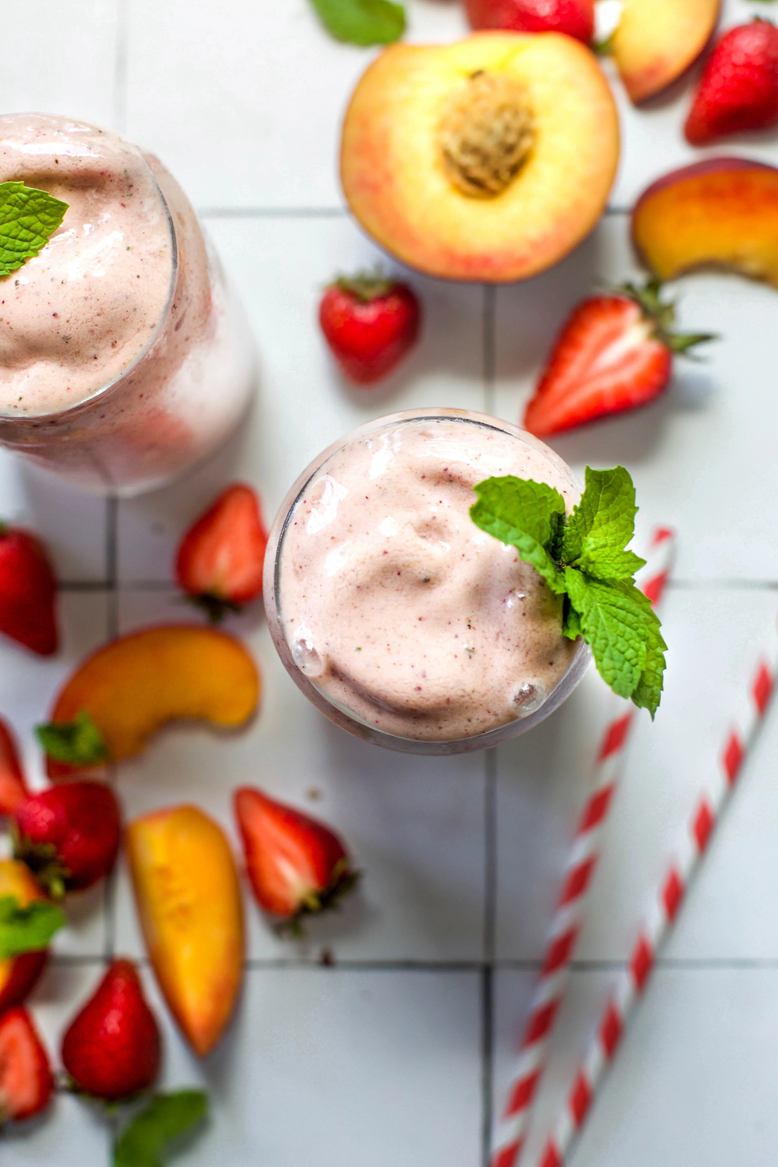 Smoothies are one of those things that we tend to make more of in the summer months. When it’s hot outside, sometimes all you want is something cold and nourishing. I love that I can pack my smoothies with good for you ingredients and that they always taste delicious too. I tend to use fruit that is in season and buy it in bulk and then freeze some of it when it gets perfectly ripe and sweet. Peaches are particularly great for this because they ripen so quickly. This recipe for my strawberry and peach smoothie tastes like a milkshake, I kid you not, and you are going to love making it all summer long!