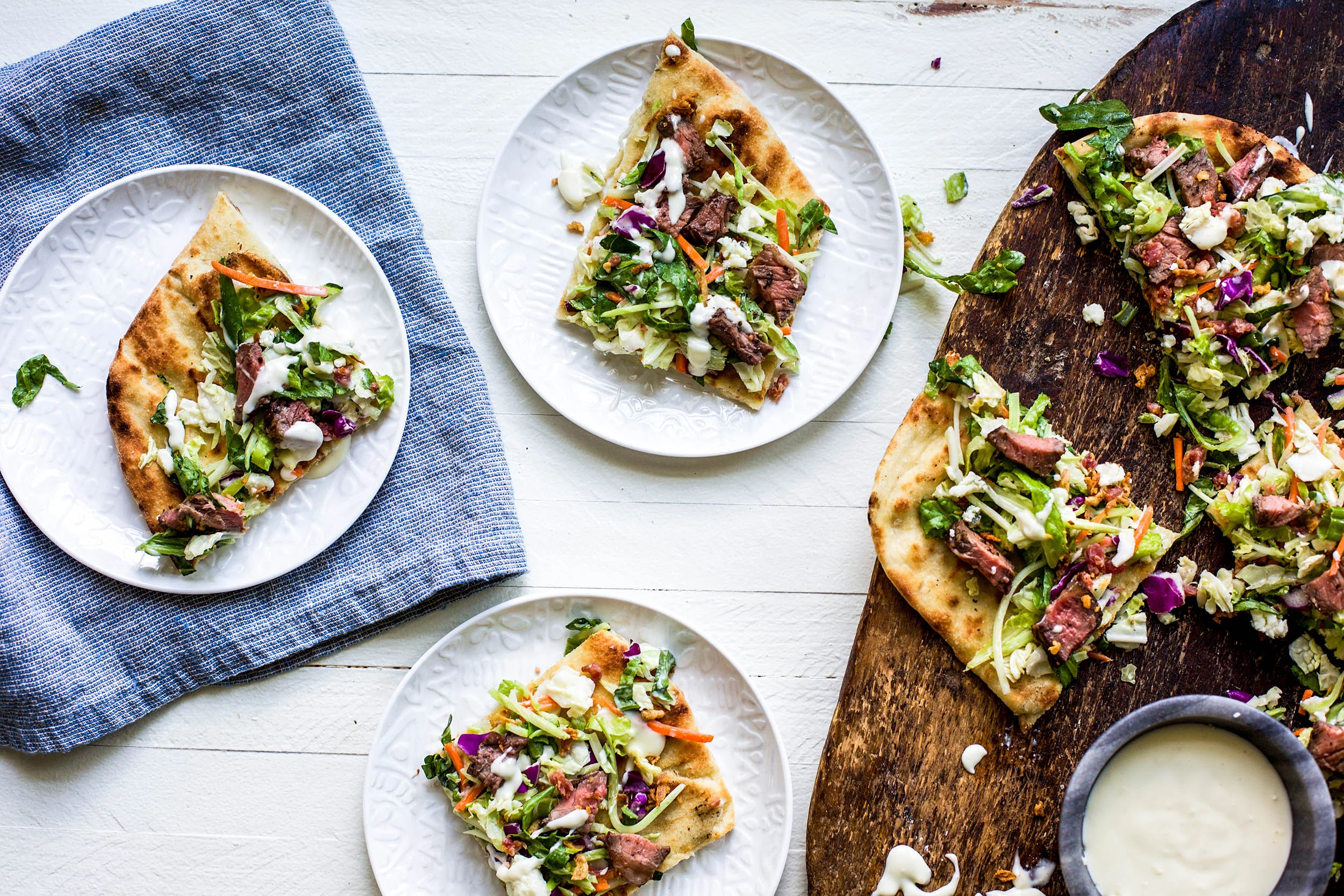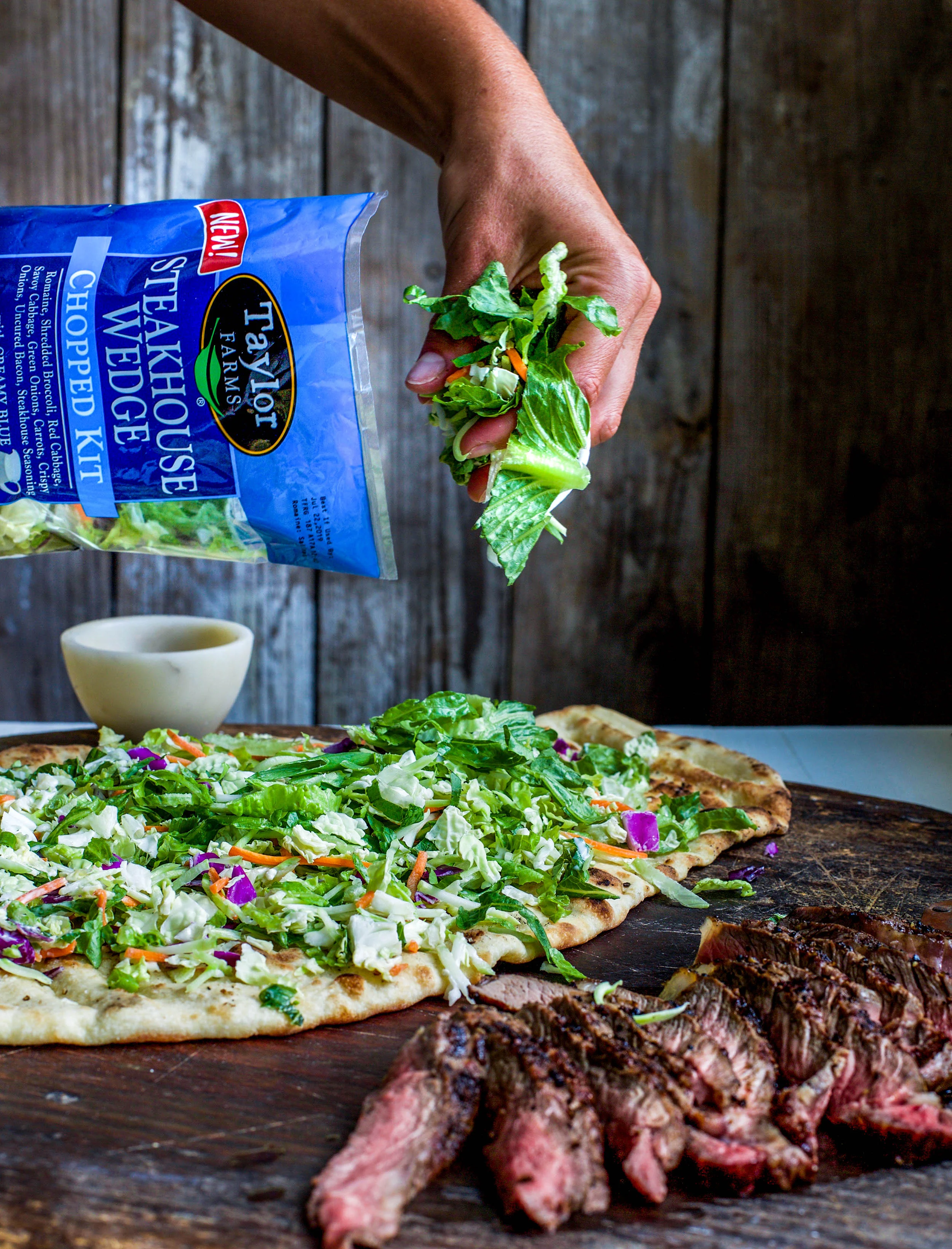 Season steak with salt, pepper, and the steak seasoning from the Taylor Farms Steakhouse Wedge Chopped Kit and rub liberally on both sides, reserving 1/2 tsp for the flatbread. Let steak rest at room temperature for 15 minutes before grilling.