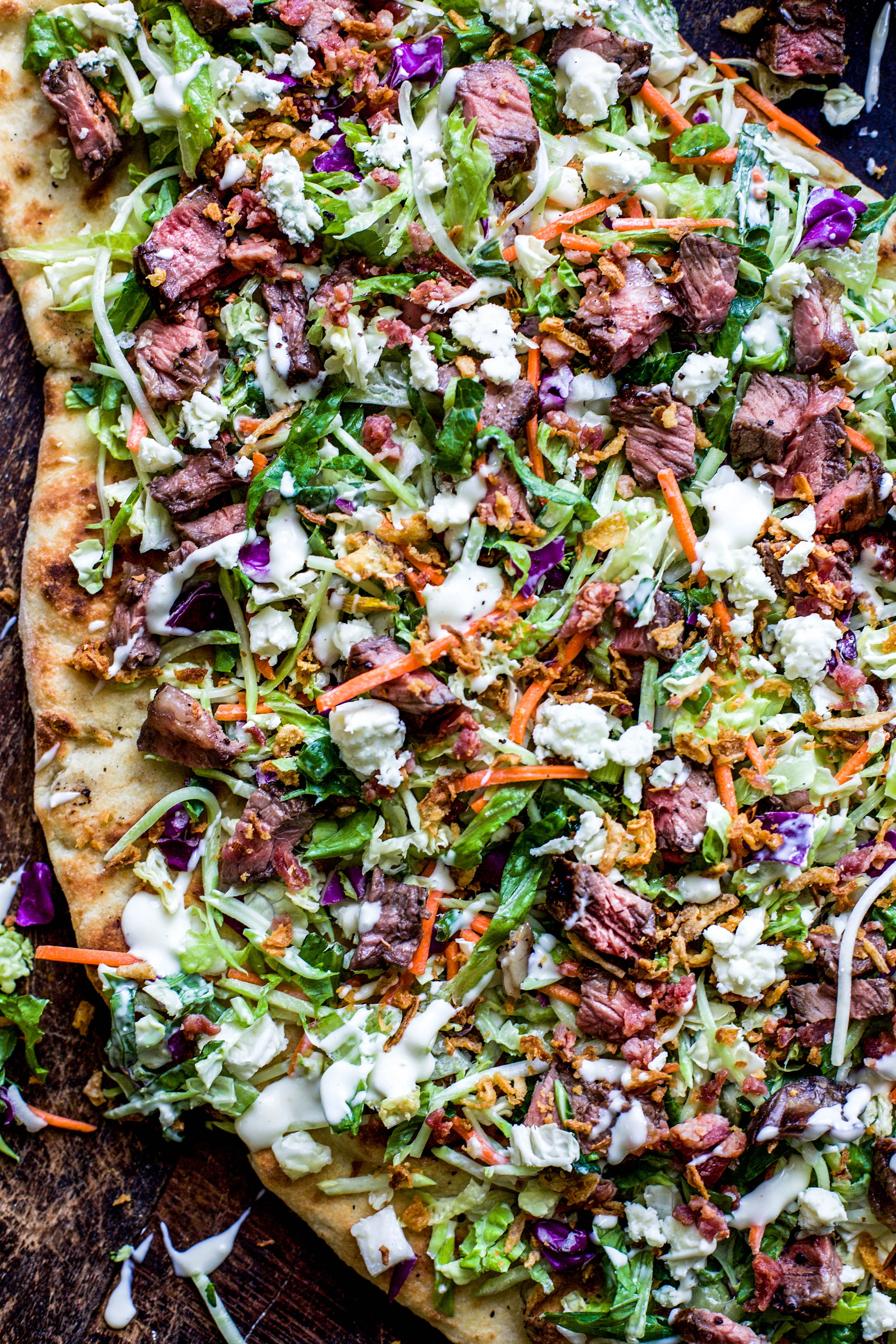 I love grilling flatbreads and pizzas! It gives the crust a wood fired oven taste (without the wood fired oven) and it really couldn’t be easier to grill up! I am notorious for grilling up anything and everything, especially in the summertime when I don’t want to turn my oven on! This grilled steakhouse salad flatbread is the perfect summer meal because we all need a little more salad in our lives and this is a fun new way to enjoy one! This meal is perfect for the whole family and you can bet even your non salad loving kiddos will gobble up their salad when its on top of a flatbread!
