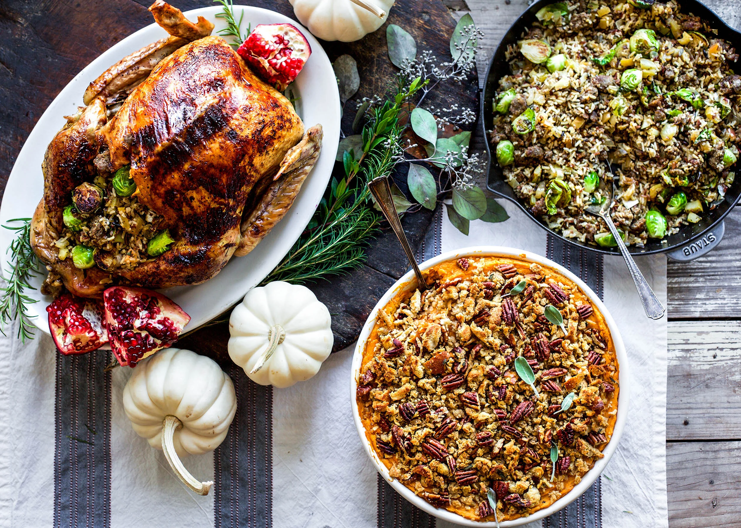Celebrate Thanksgiving this year with three brand new recipes that are sure to wow your friends and family including a turkey that is a major show stopper. I created a simple, but flavorful and special turkey that is easy enough for any at home cook, no matter the skill level. No fancy equipment needed, just a few really flavorful ingredients that transform a turkey into a gorgeous centerpiece for any Thanksgiving table! Lucky for you I included a few of my favorite side dishes to make your menu complete! My Rosemary Pomegranate Maple Glazed Turkey is easy to make and is topped with a rosemary infused pomegranate glaze that takes this roasted turkey to a whole new level.