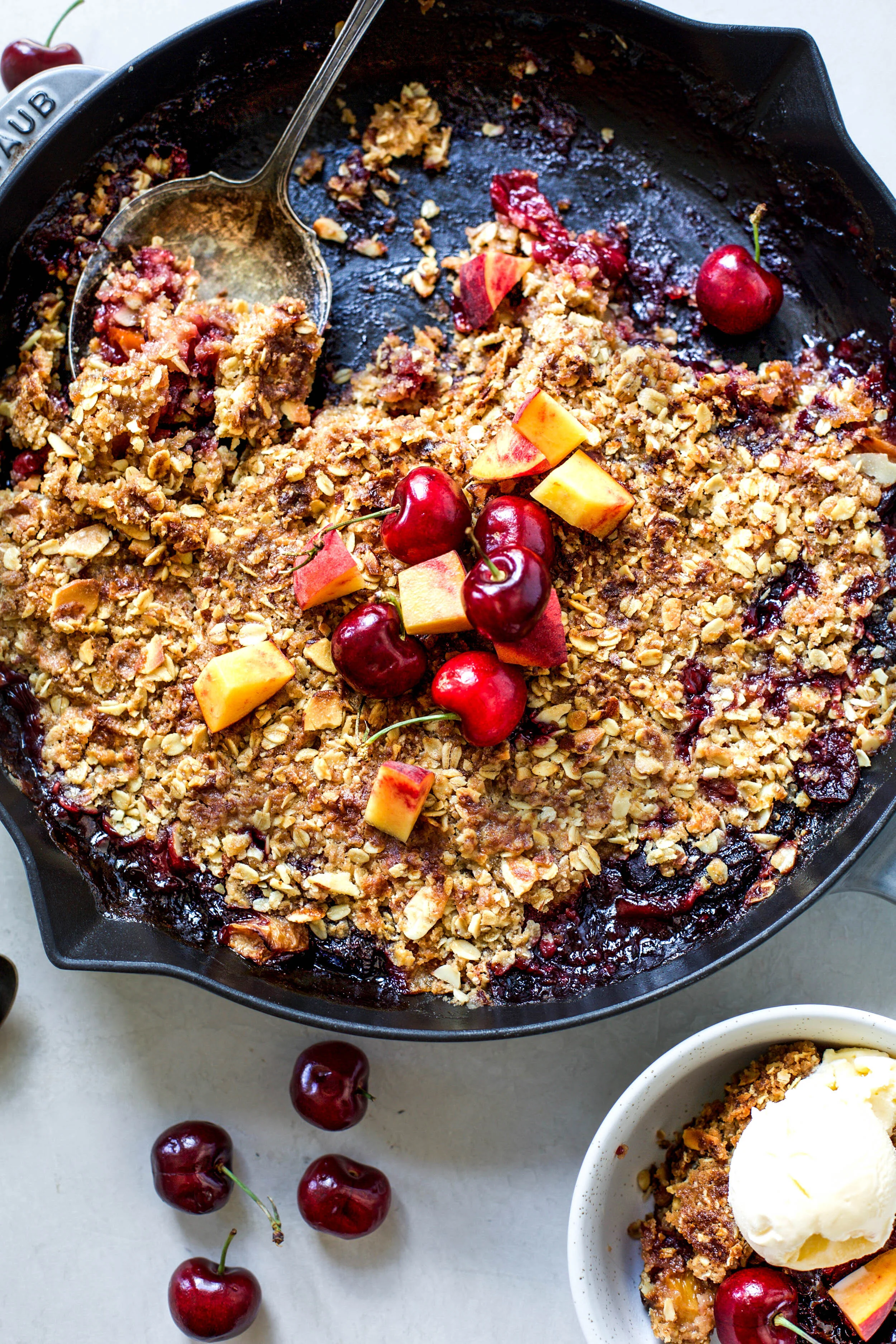 If you are finding yourself knee deep in summer fruit like cherries and peaches and can’t eat them fast enough before they all go bad, then I have a solution for you. A summer crumble is the best way to use up any fruit that you have on hand and it is always a crowd pleaser. I tend to get excited and overbuy all of the fruit in the summer and end up with a handful of fruit that ripens too quickly on me. Instead of letting it go to waste, I like to make a yummy dessert out of them instead. This recipe for a cherry peach crumble is truly summer in a bowl, especially topped off with a little vanilla ice cream.
