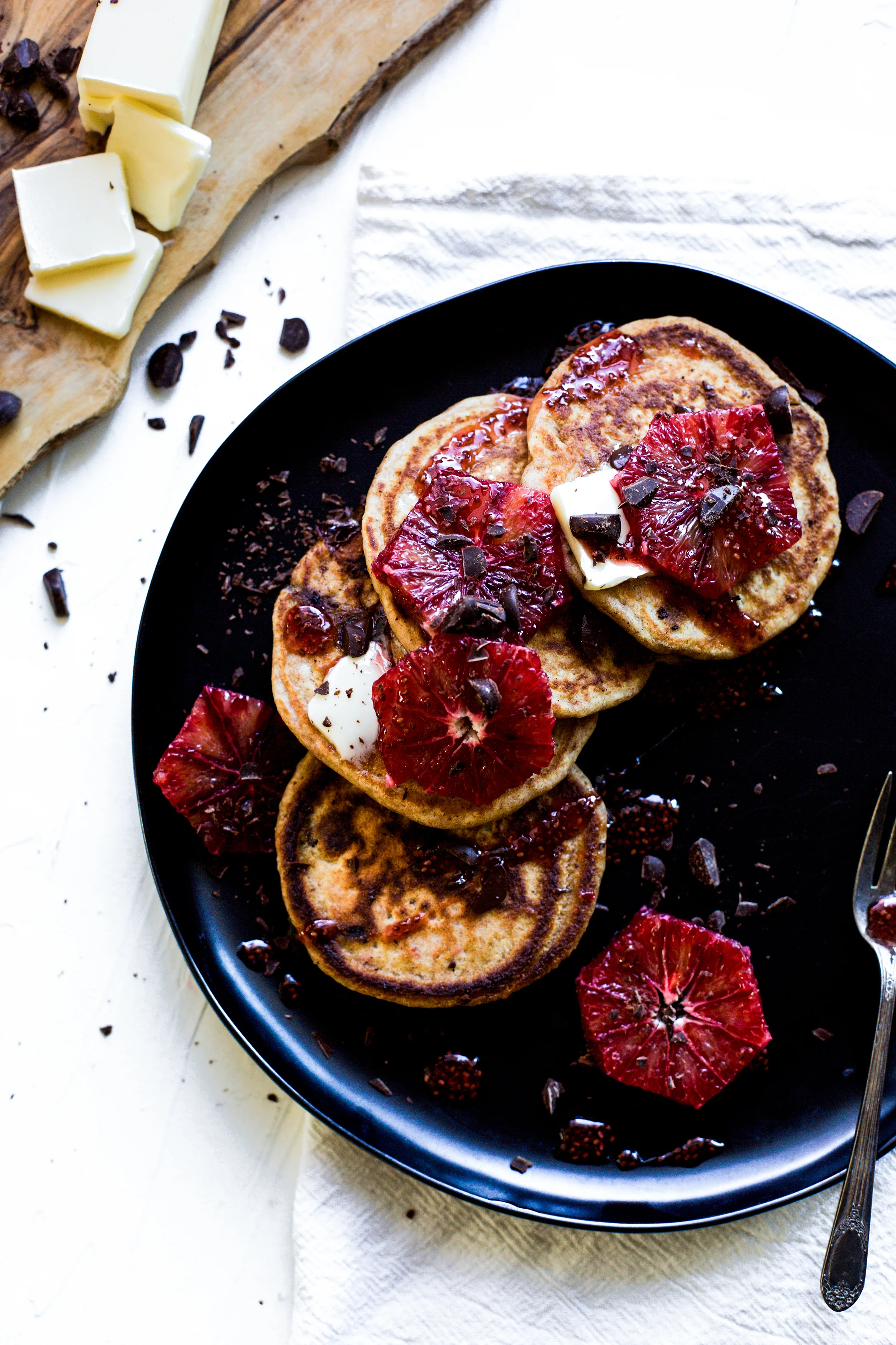Whole Wheat Dark Chocolate Chip Pancakes with Blood Orange Chia Syrup