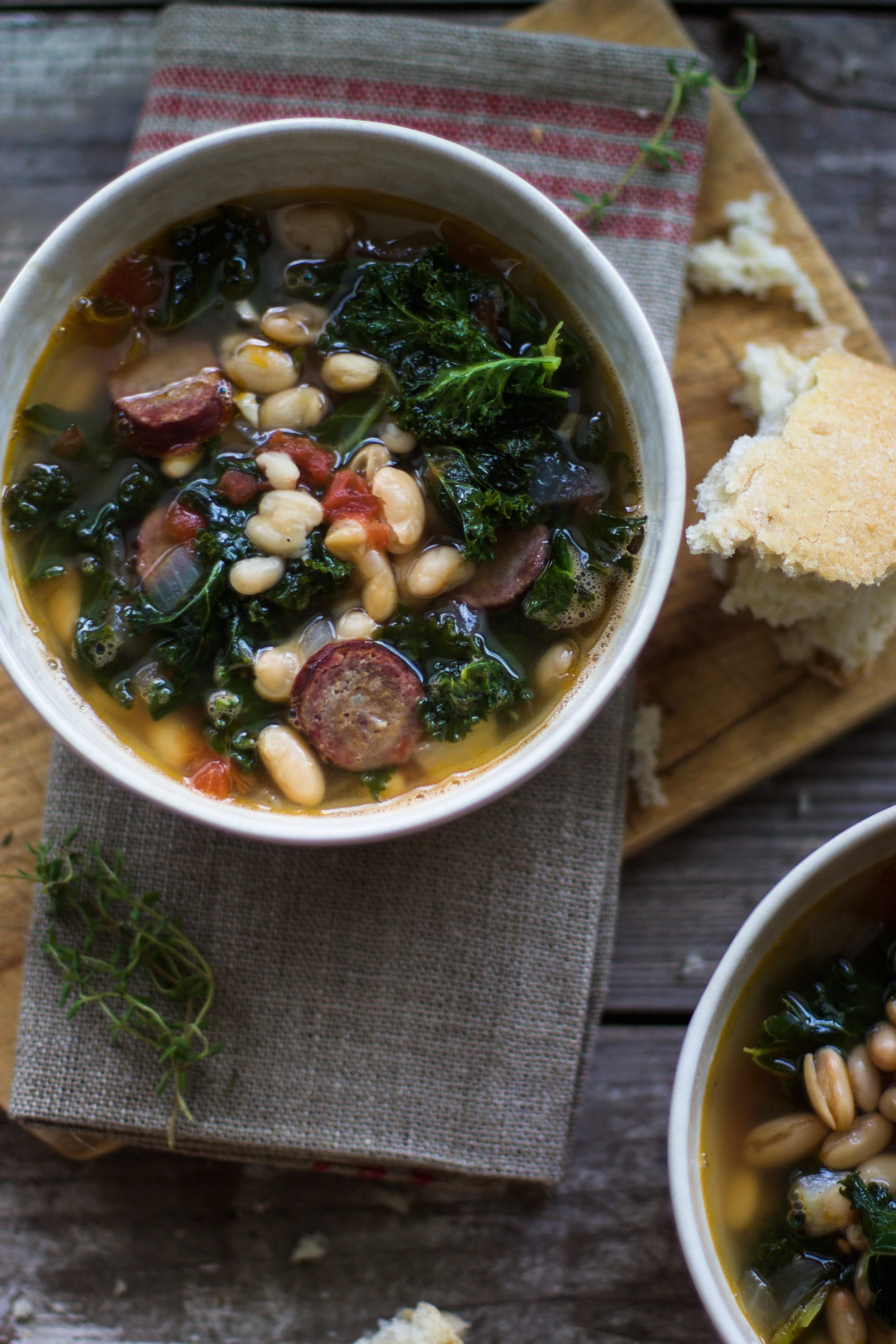 The weather has turned only slightly here, but there has been a new crisp evening air that has me craving all things comforting for dinner. Something somewhat healthy, that is warm and full of flavor is usually what I try to make! Soups are so good for just that because you can make them ahead and eat on them all week for easy dinners and for the most part you can control the ingredients keeping them as healthy as you and your family want them! My easy white bean, smoked sausage, and kale soup is just the kind of meal that I crave on a weekly basis!