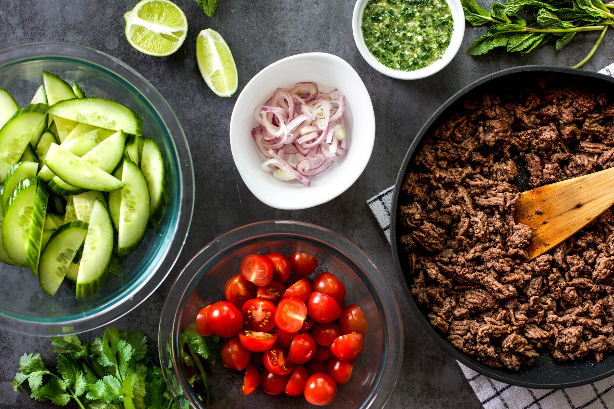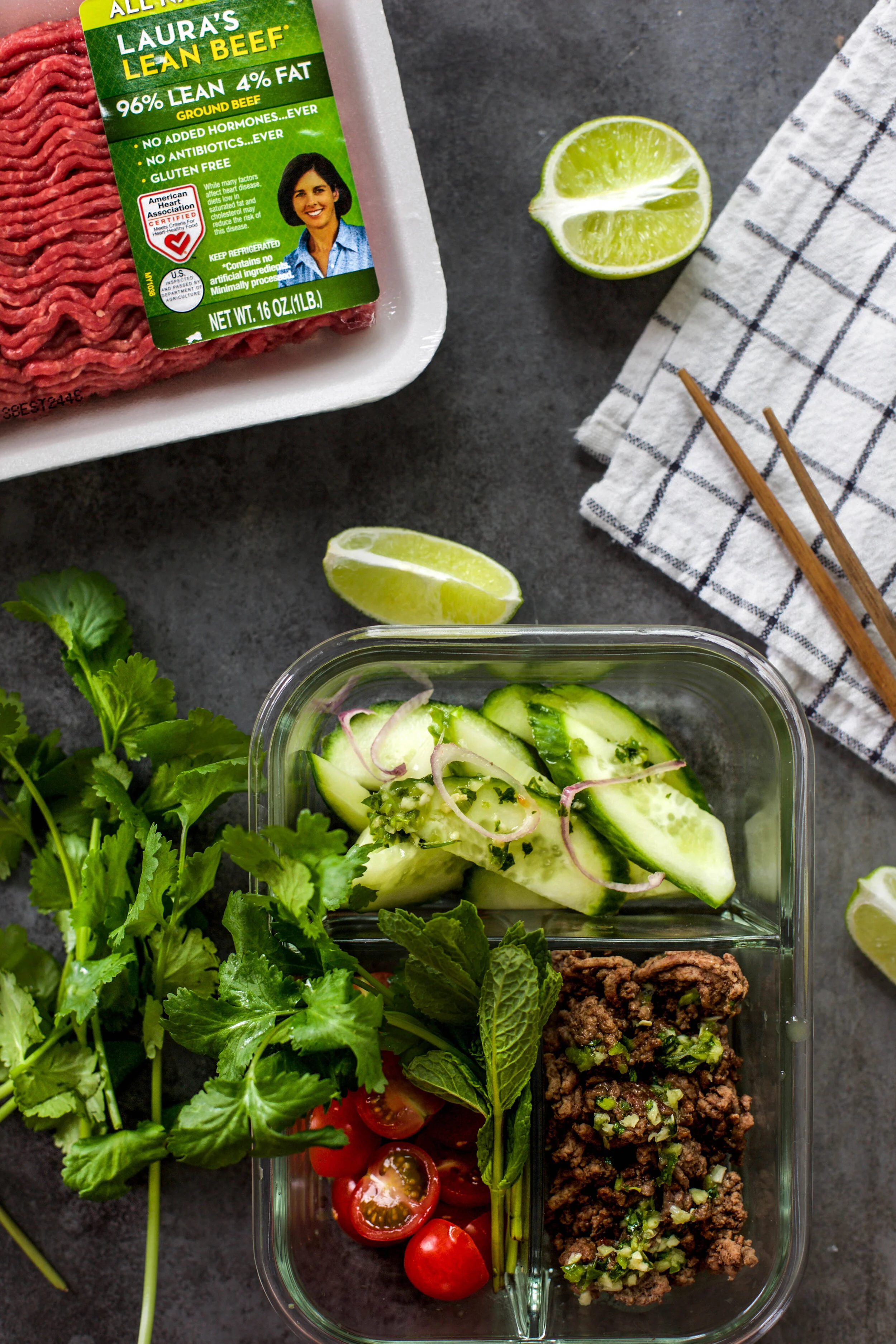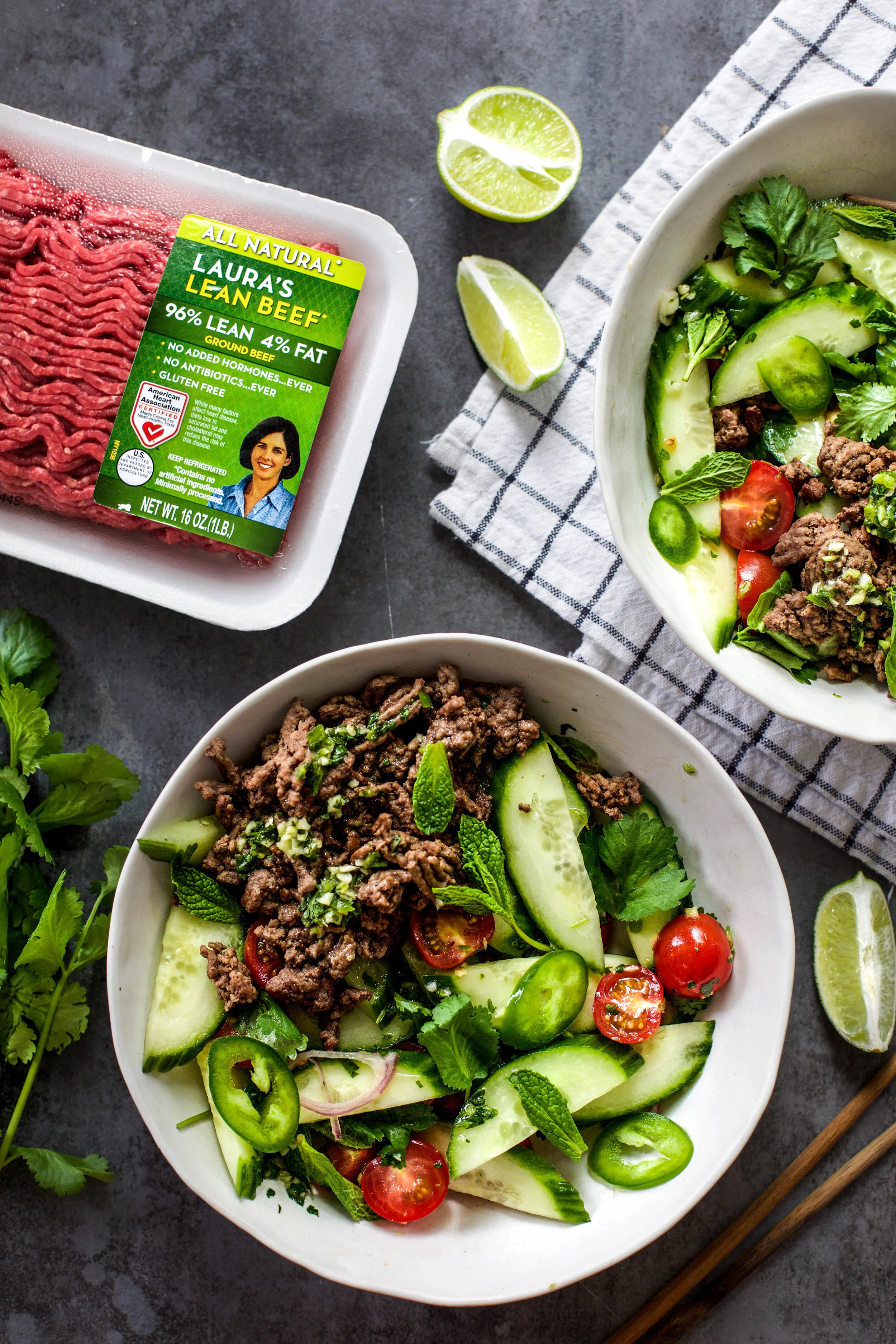 Meal prepping at least one meal for the week is something I always strive to do because it makes my life so much easier on busy days. That’s why I partnered with Laura’s Lean to bring you a delicious meal idea that is perfect to meal prep for weekday lunches or dinners. Ground beef is one of those proteins I love to keep stocked in my freezer because of it’s versatility with recipes and with Laura Lean Ground Beef I can feel good about the food I am feeding my family. This recipe for Thai Ground Beef Salad is full of flavor, easy to prep, and will quickly become one of your favorite salad recipes!