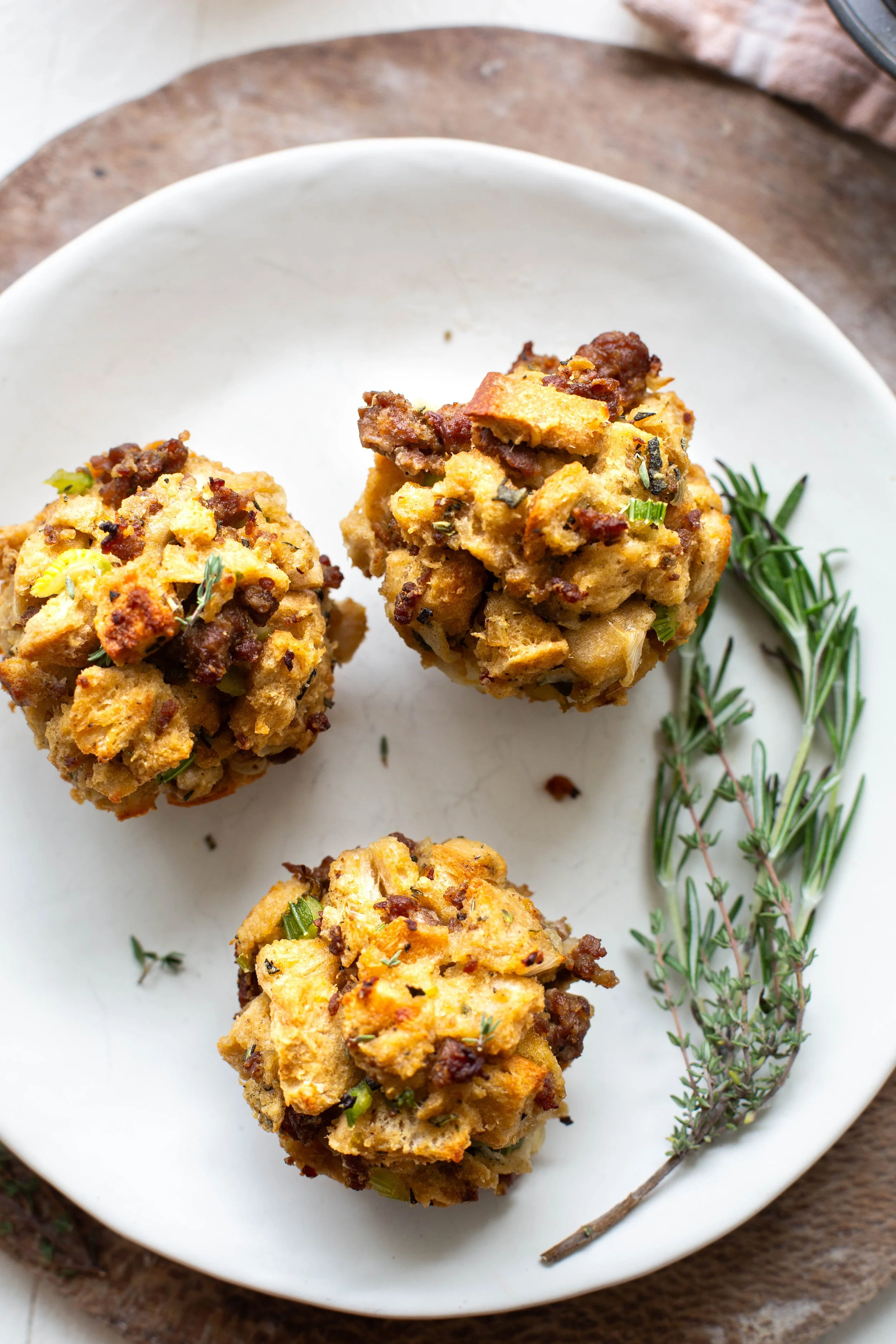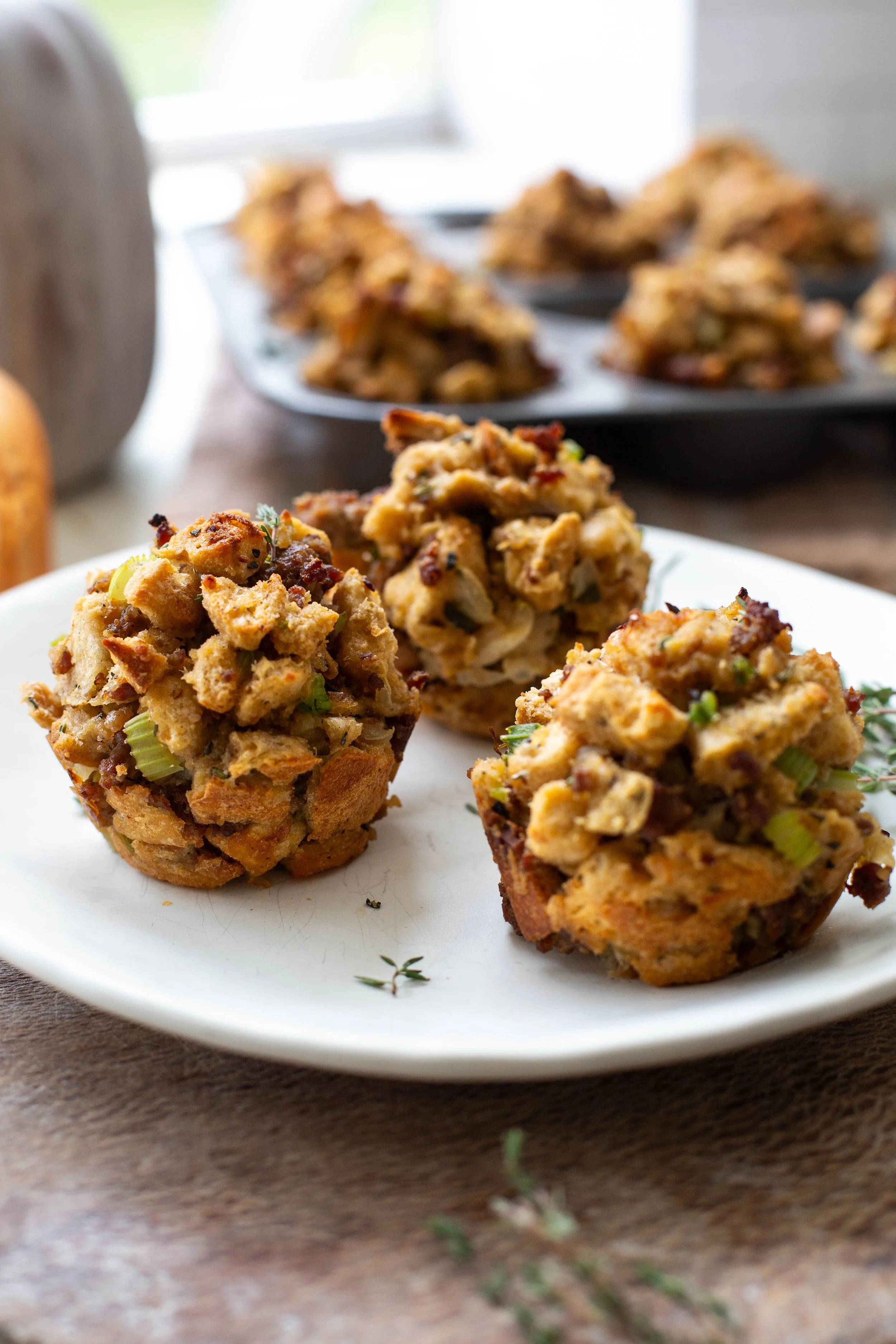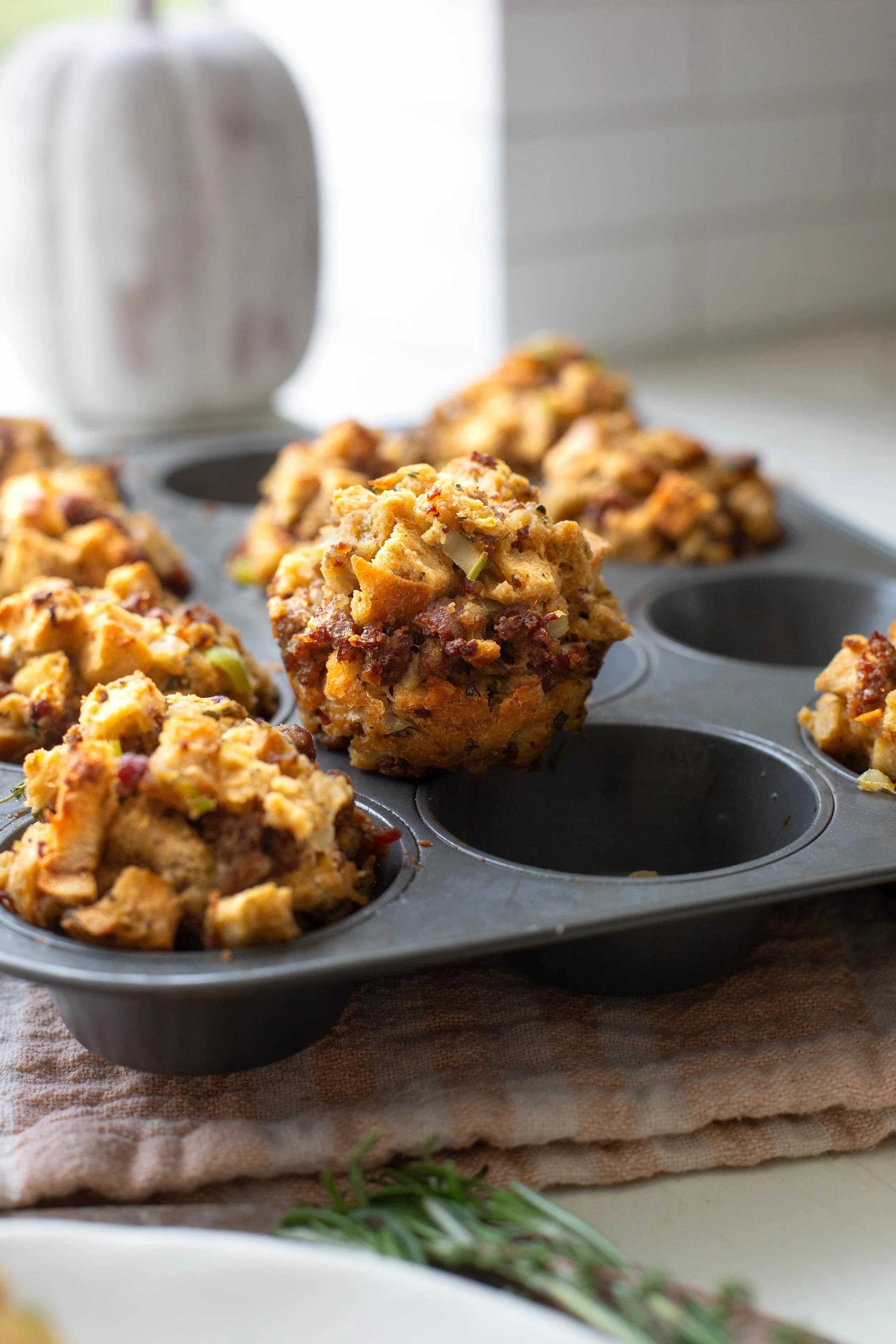 One of my favorite side dishes at Thanksgiving happens to be stuffing and these stuffing muffins are a twist on my favorite sausage herb stuffing. I am just in love with these mini versions of my favorite stuffing and think they are such a great addition to your holiday table.
