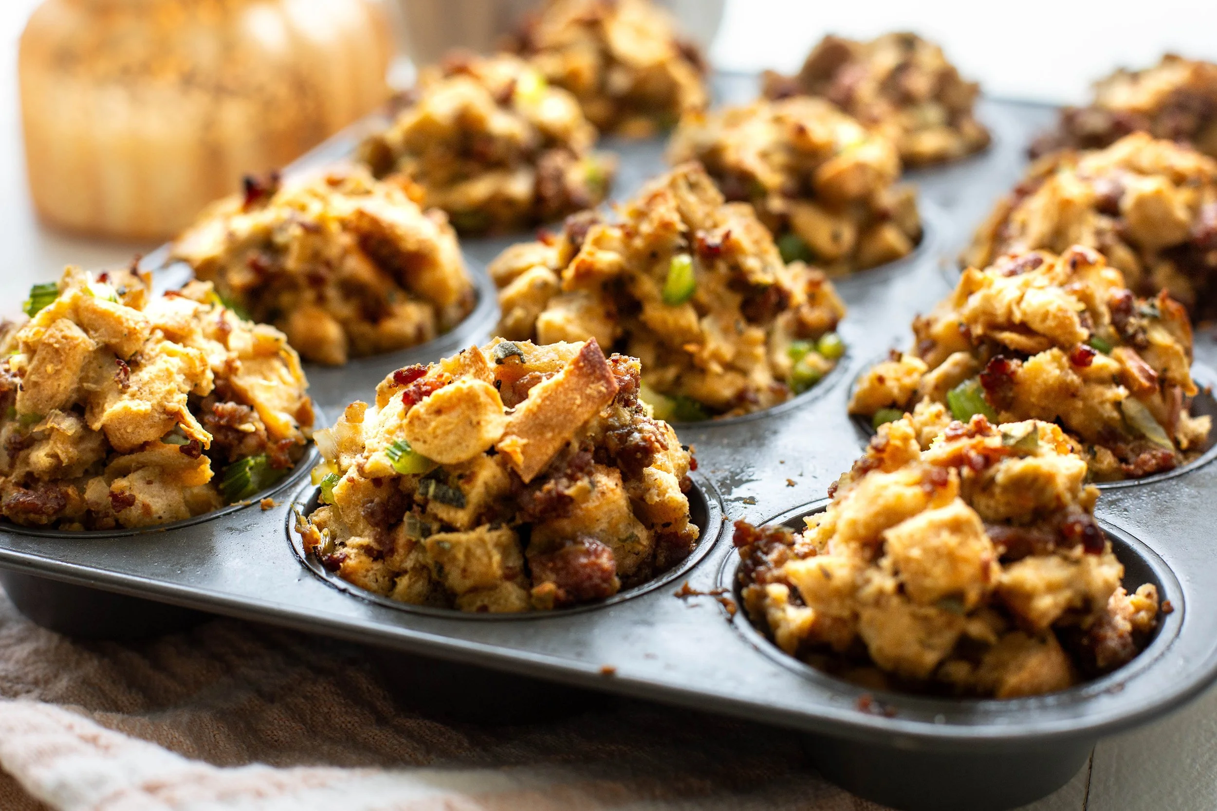 Scoop the stuffing mix into generously buttered muffin tins until full, making sure to pack them in so they stick together as they bake.