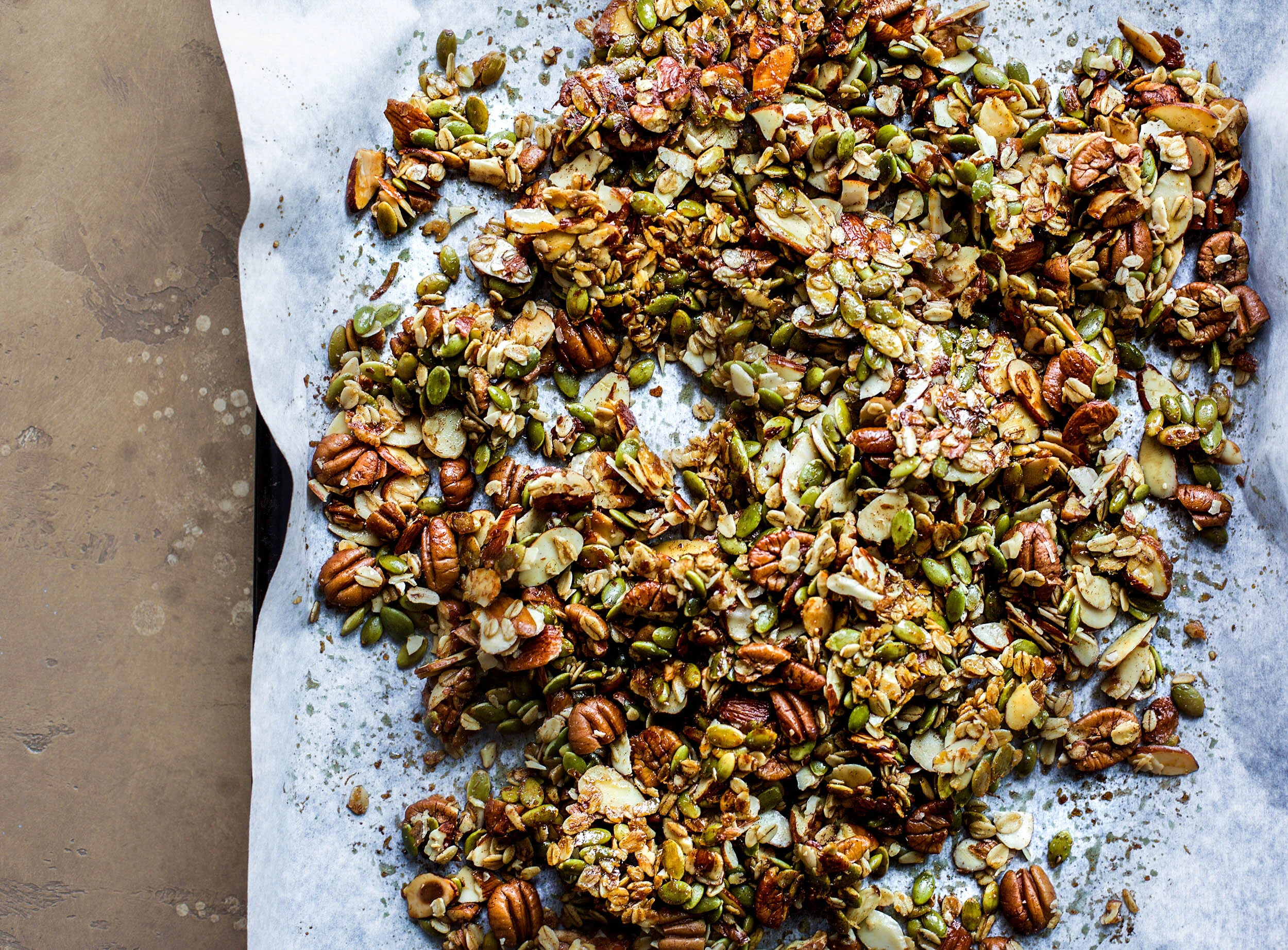 Mix pepitas, almonds, pecans, oats, chia seeds, hemp seeds, salt, and cinnamon onto a baking sheet lined with parchment paper or a silpat liner.