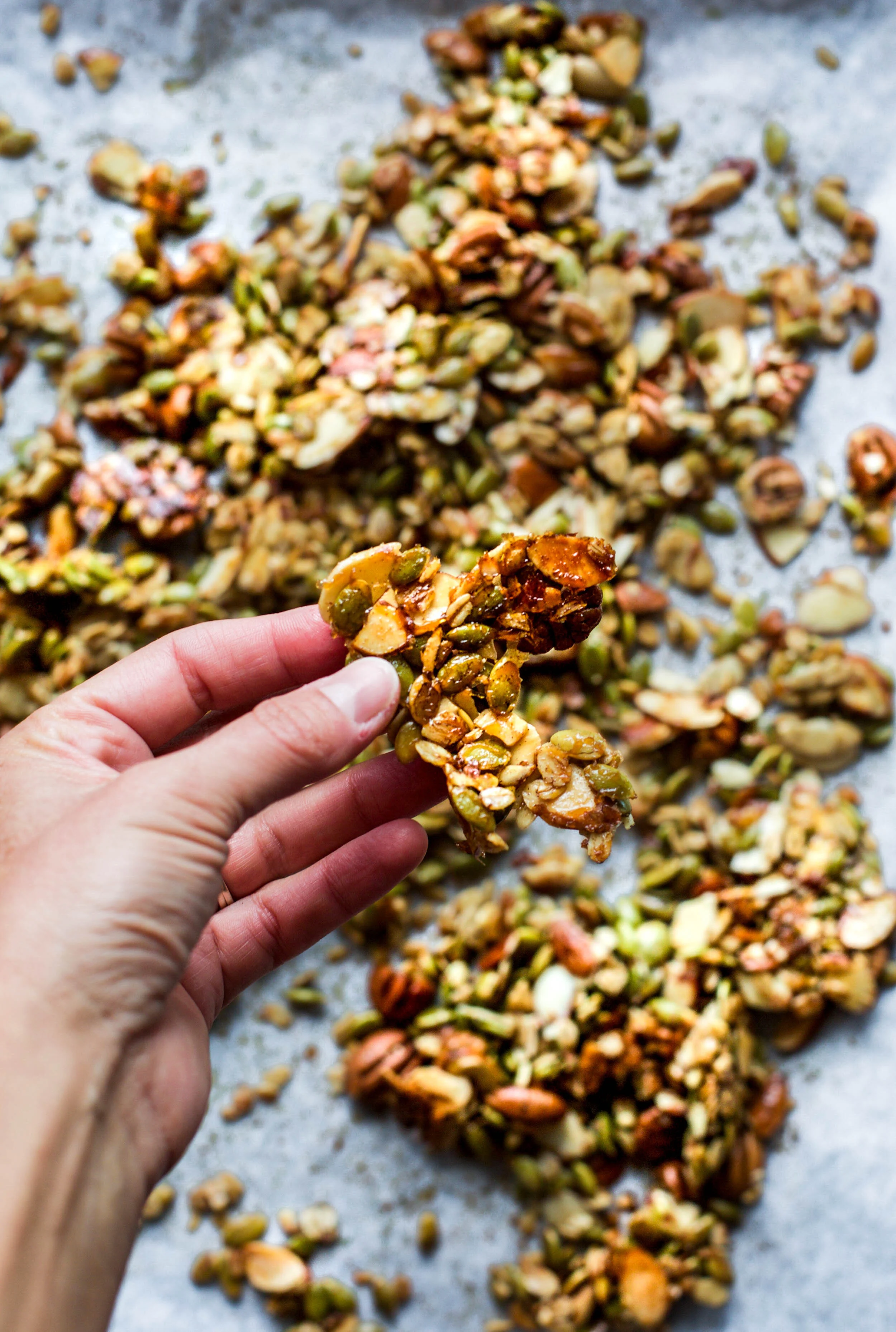This is a granola unlike any other granolas. This pepita granola is one that I originally made to go on top of a fall chicken salad, but because of it’s popularity, I decided that it needed to have it’s own special space for you to reference. And if you are thinking “granola on a salad?” I would say, don’t knock it until you try it! It’s actually quite the combo and provides the perfect little crunch and slight sweetness that takes your salad to the next level. Of course if you are a granola purist, and simply want to eat granola for breakfast or a snack, that clearly works too…which is why I decided to give this granola it’s very own post. This recipe for the best pepita granola will have you wanting to make a new batch to have on hand every single week.