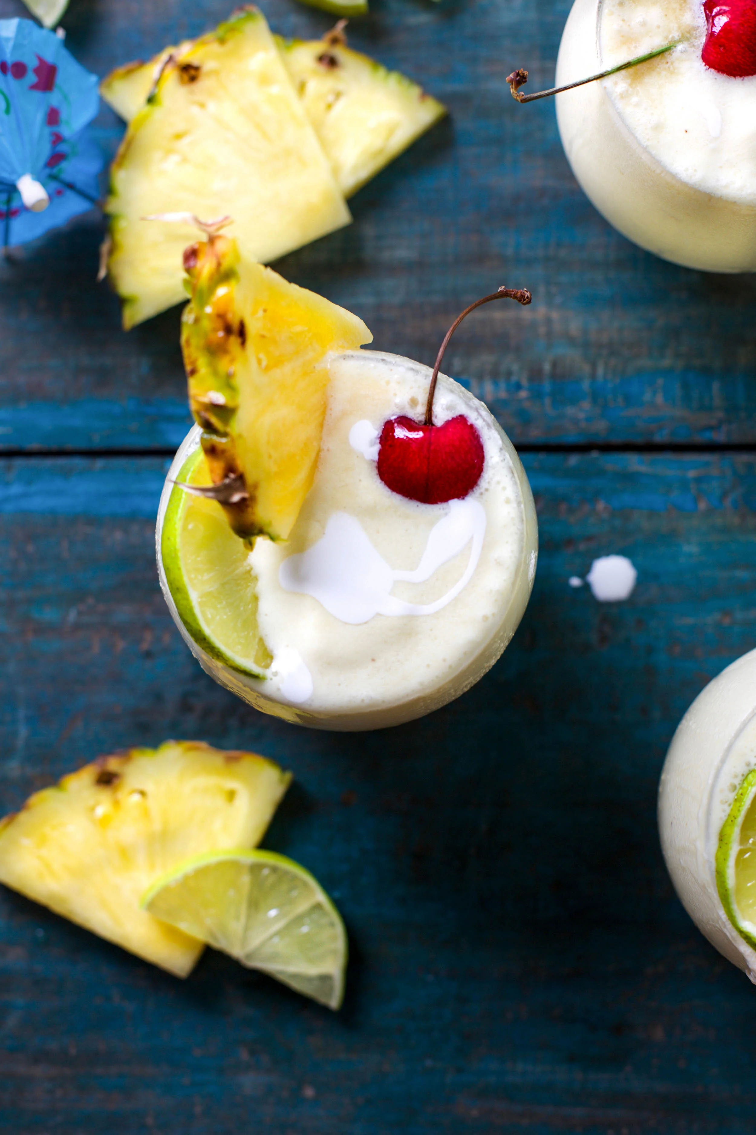 I don’t know why we tend to only drink pina coladas on vacation, because they are truly so simple to make and when you make them at home, they are not too sugary and taste so fresh. I use fresh pineapple that I freeze (you could also just buy frozen), coconut milk, cream of coconut, rum, and lime juice! It doesn’t get much easier than that and there is no added sugar. I simply blend up the ingredients until smooth and creamy and then top off with a little dark rum for color and taste and garnish with fresh fruit. You could also make a non-alcoholic version of this recipe by simply omitting the rum here and it would taste like a tropical smoothie! Delish either way!