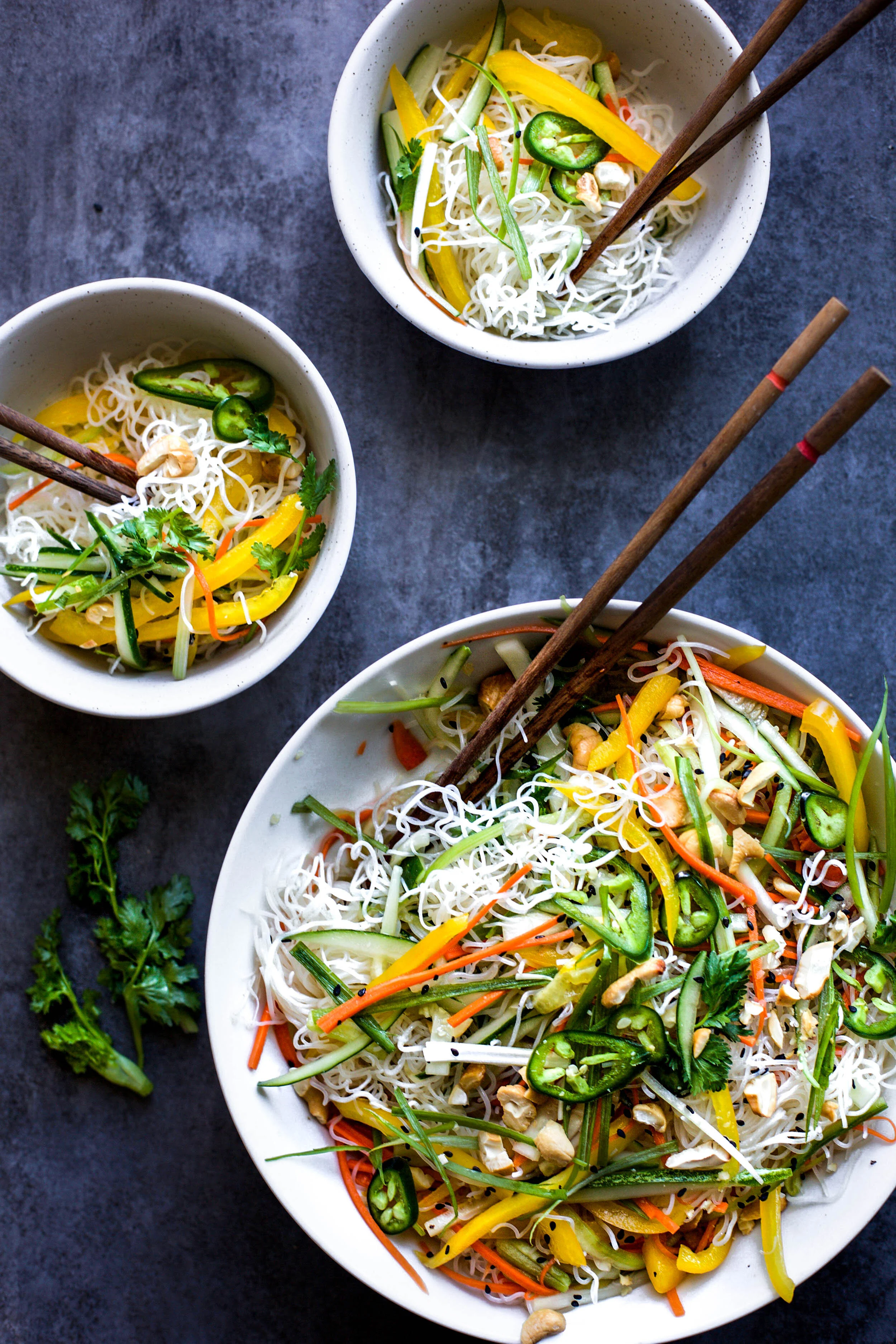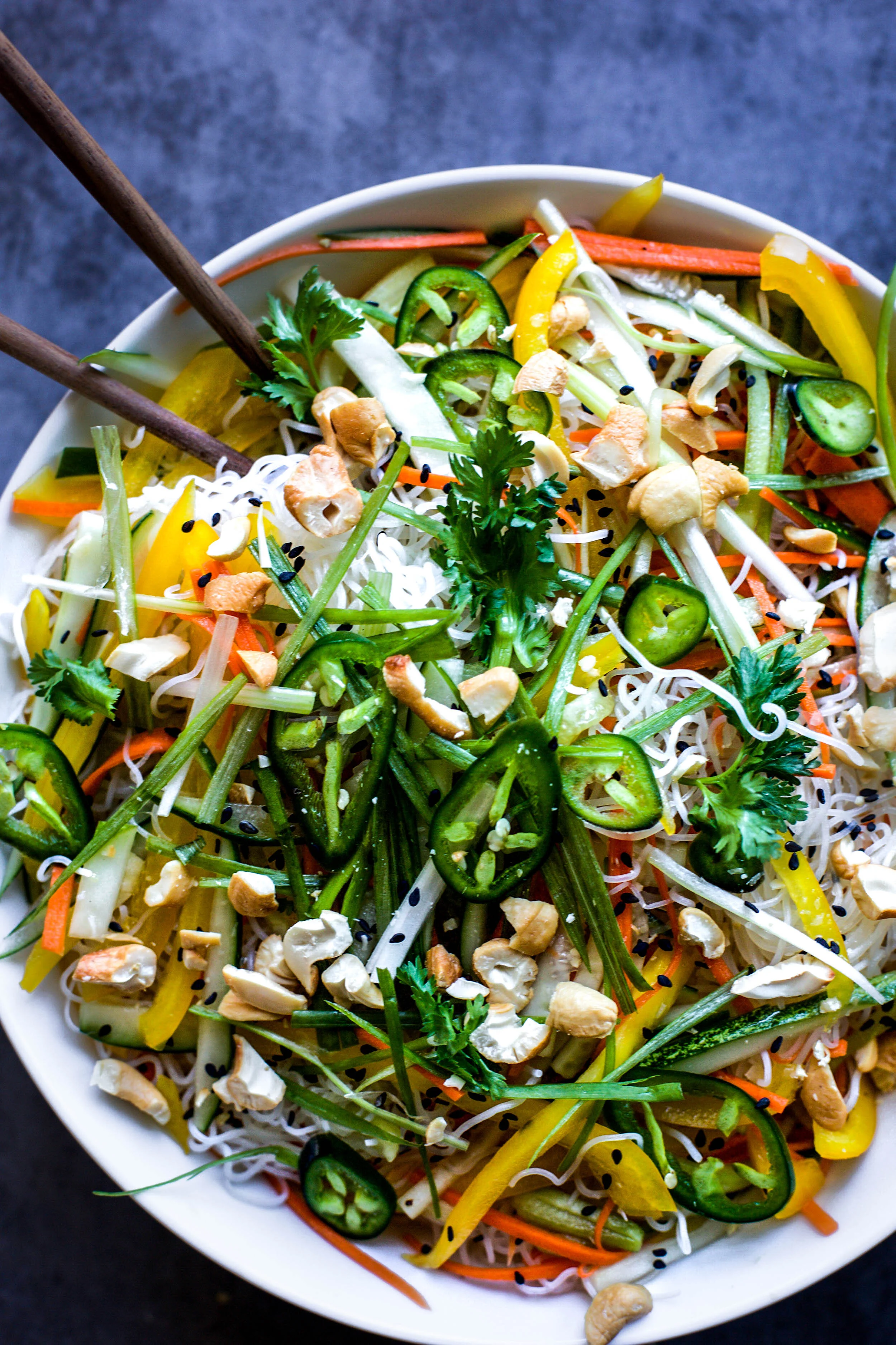 This light, flavorful, and easy Vietnamese noodle salad is one of those dishes that pairs perfectly with grilled seafood or chicken, but also can be great for a make ahead lunch idea. Rice noodles get loaded with vegetables and tossed with a delicious rice wine vinaigrette that only gets better the longer it sits in the fridge. I love making it ahead of time and eating it for lunch all week long or having it on hand for and easy dinner side dish. This Vietnamese vegetable and noodle salad recipe is easy to make, can use up whatever veggies you have in your fridge, and is a winning dish with the whole family.